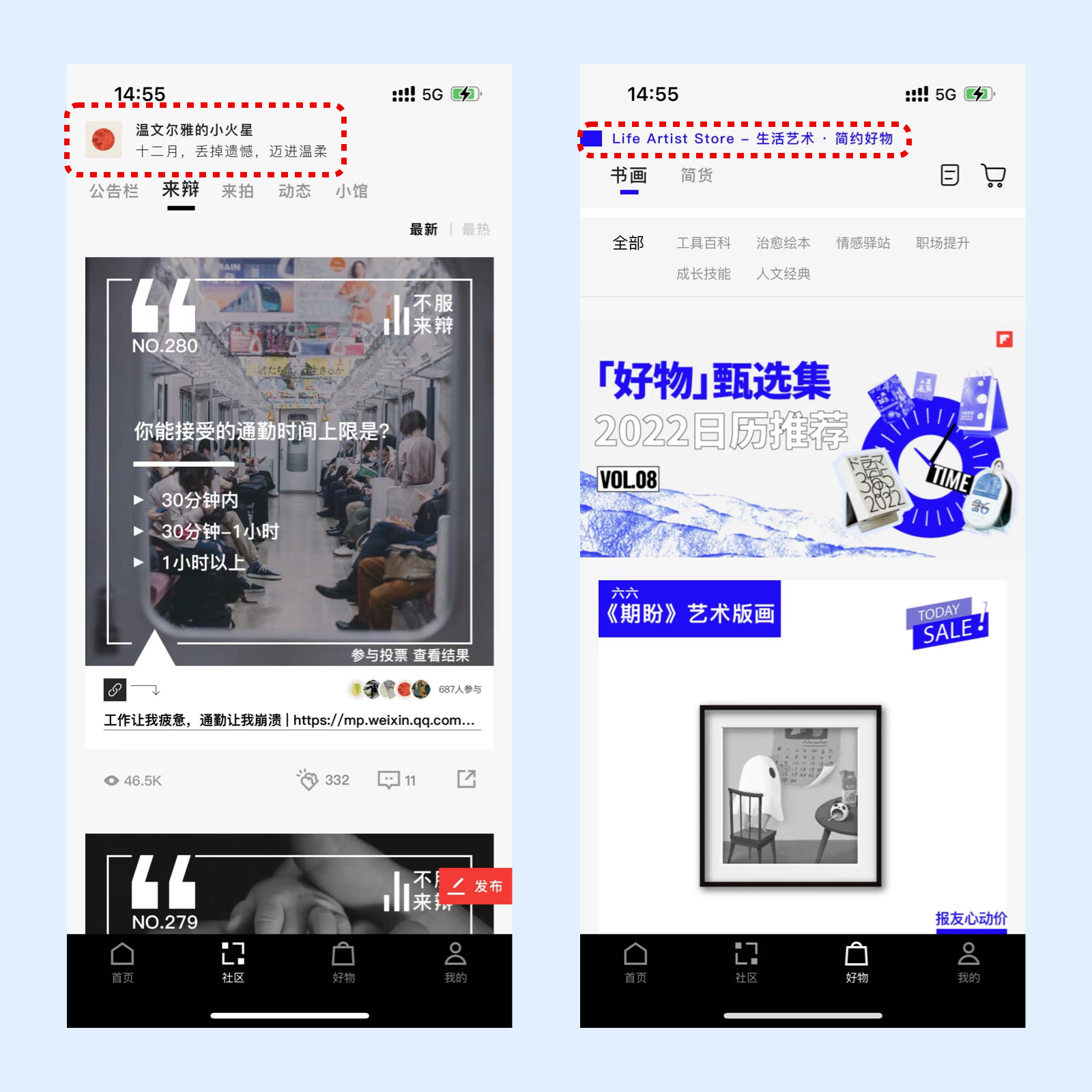 启动红板报之后切换到第二、三个标签社区、好物中可以看到,页面顶部会有不一样的视觉设计和功能安排,在社区中顶部是个人头像和名称,点击后跳转到我的页面。在好物中页面顶部则是一句与好物有关的文案。