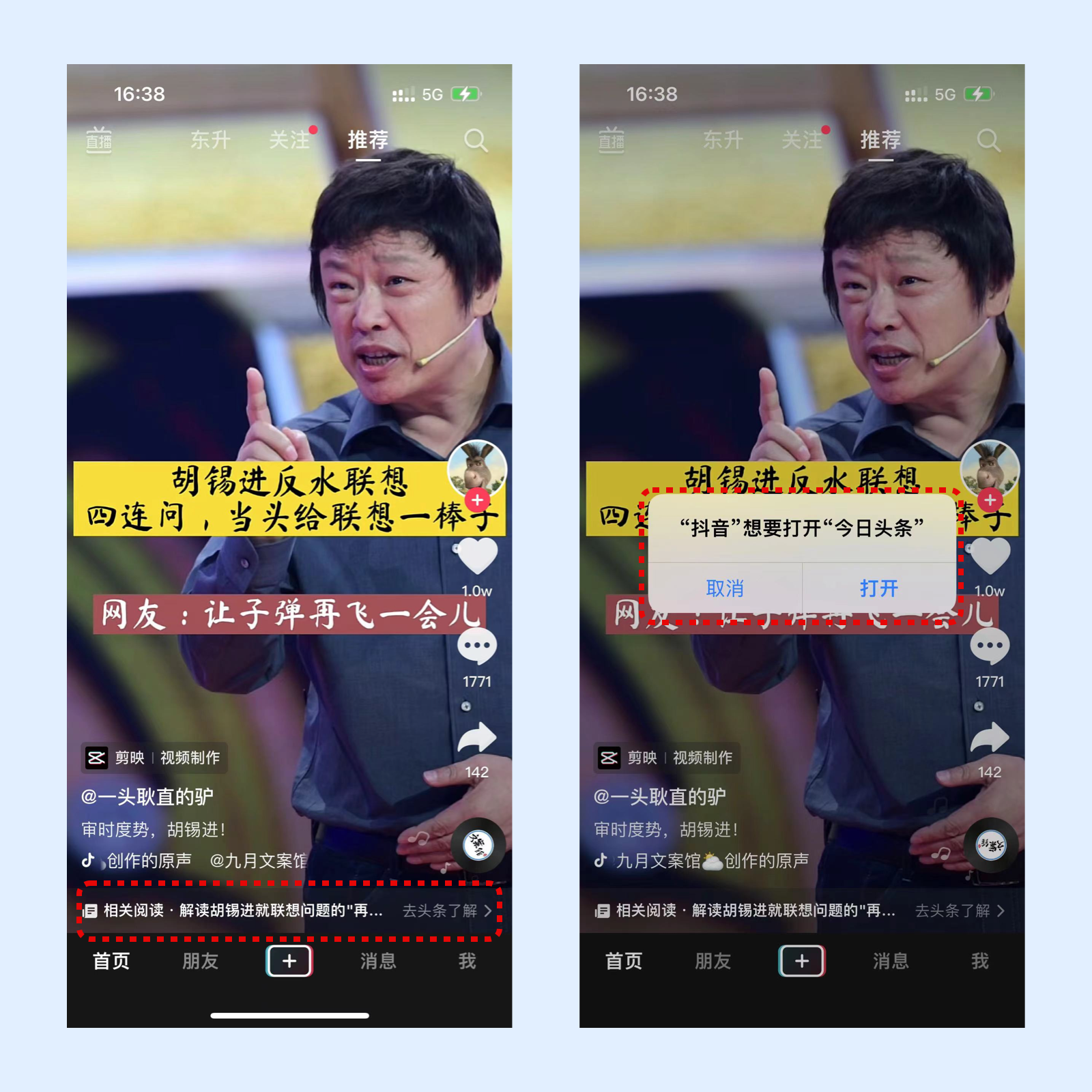 在浏览抖音短视频时可以看到一些视频底部会有相关阅读的连接,点击后弹出弹窗显示是否跳转今日头条。