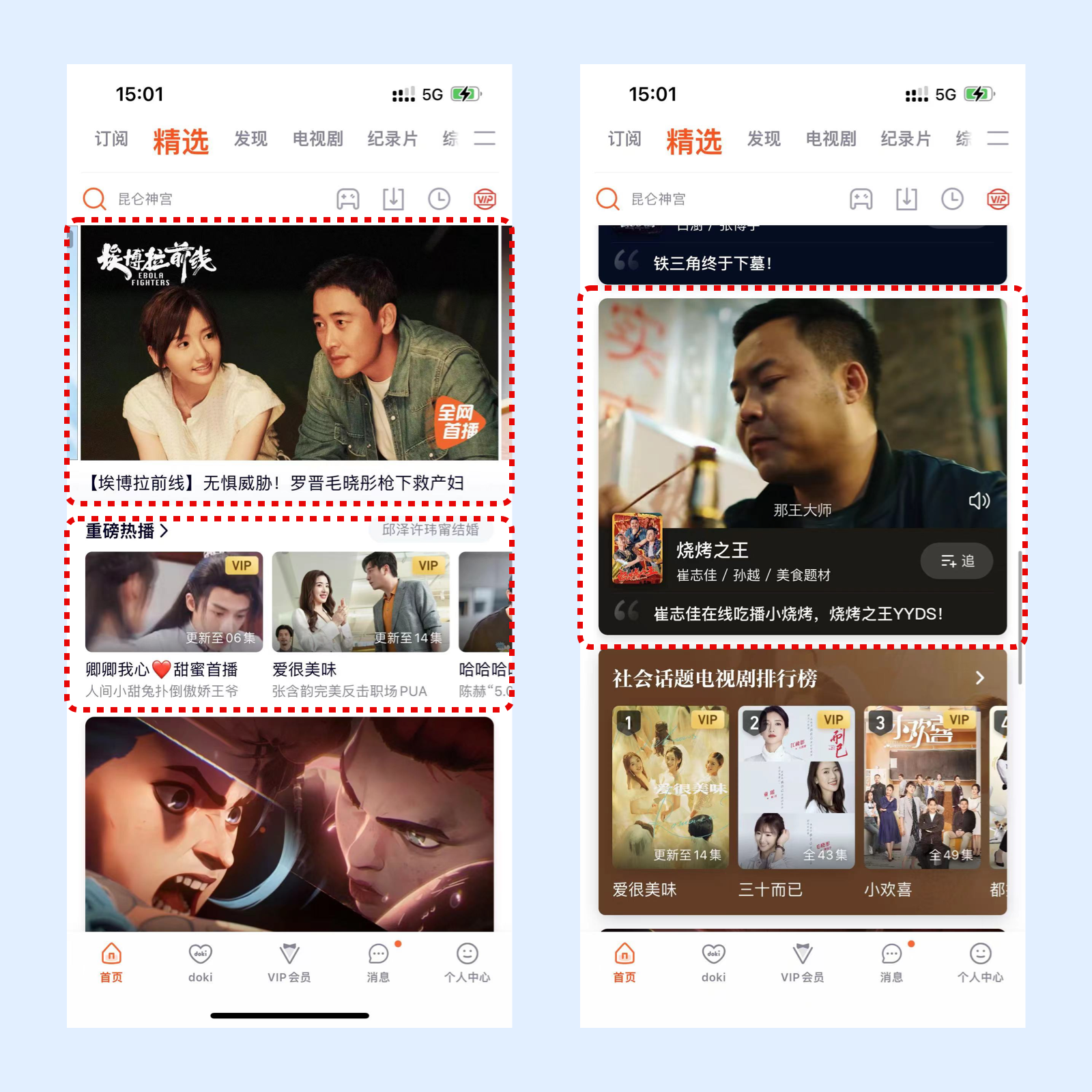 在首页中热播这里,后面的更多按钮设计成滚动的文案按钮,对比常规的按钮,动态的形式更容易吸引用户点击,不过这里点击之后并不是去更多,而是对应文案的相关详情页,也是直接将用户引导至目标页面,减少在列表中反复横跳导致的用户流失。同时,热播这里通常处理都是给一块空间做个性化设计,但是这里并没有过多的做同质化设计,反而可以留出空间放更多推荐的内容。