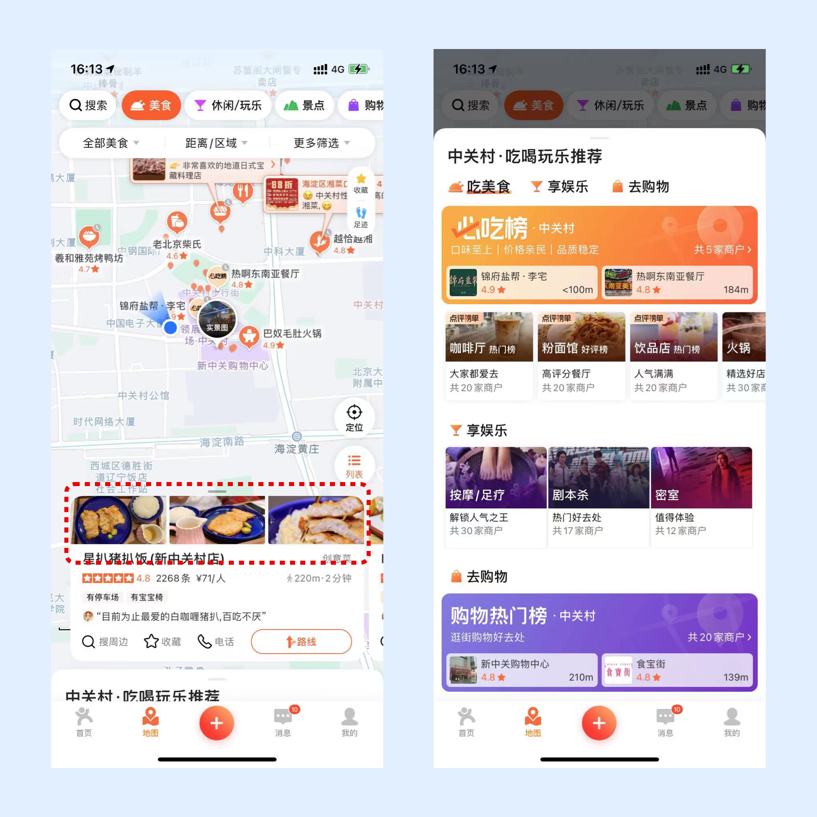 进入大众点评,点击地图进入地图找店,可以看到选中图标弹出的弹层增加了图片展示。