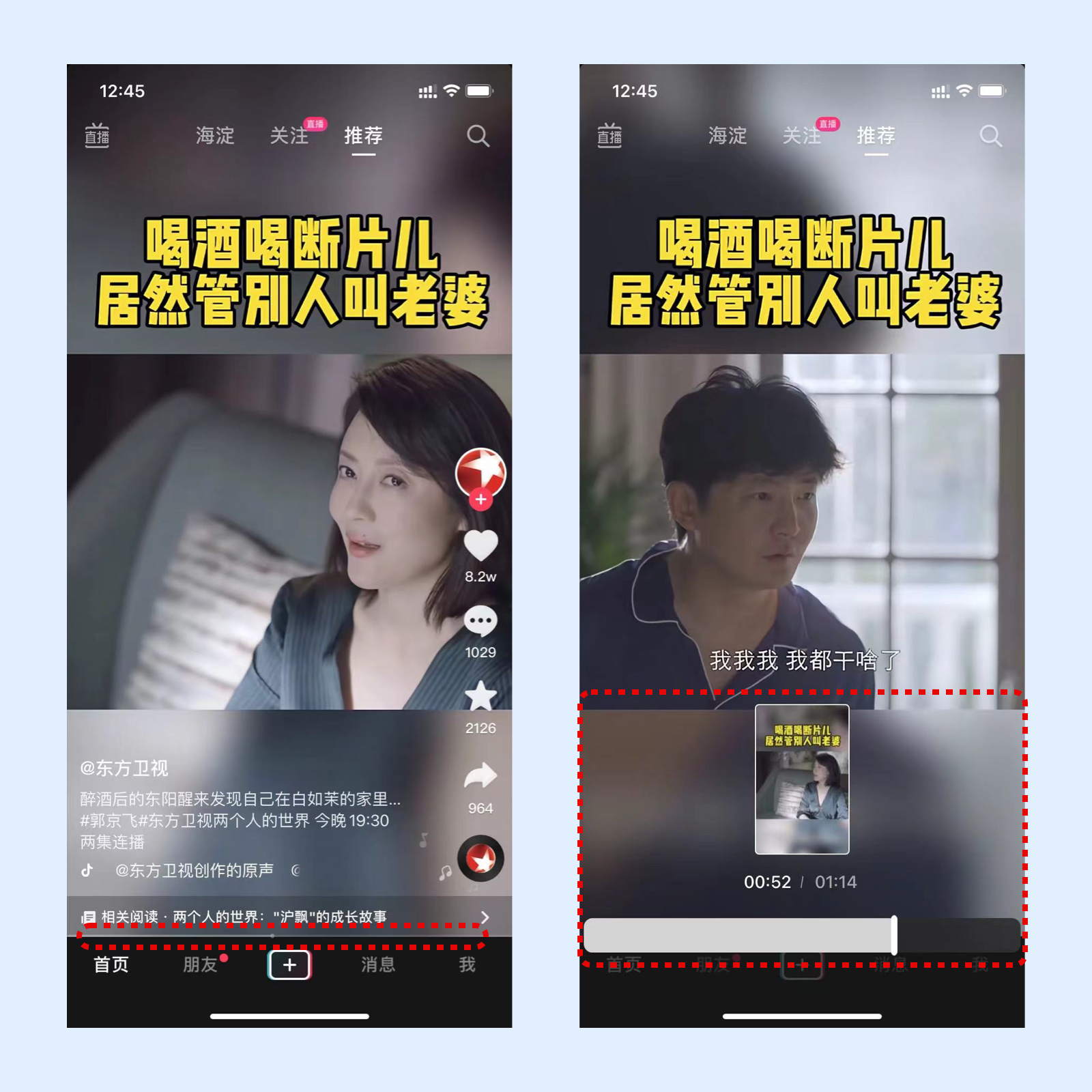 更新前的观看短视频也是可以拖动进度条的,但是误操作的风险是很大的,比如你有没有发生过在拖动进度条的时候触发了左右划的手势操作,从推荐不知道什么时候就去关注了。在加重进度条的操作后,用户可以很明确的看到知道自己操作的部分,减少因热区过小带来的误触发生。