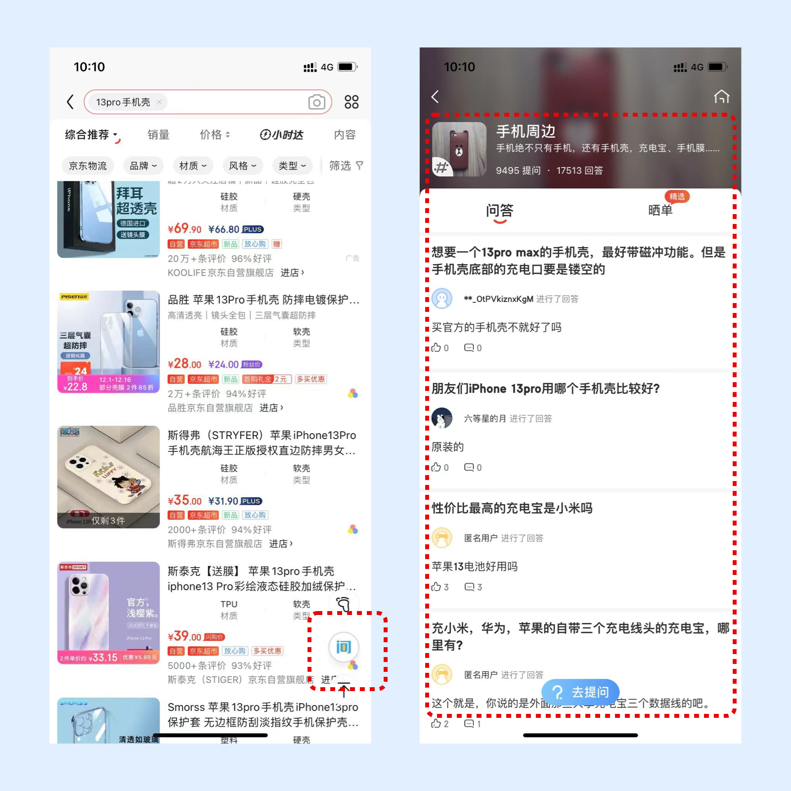 在京东购物时搜索目标商品,搜索结果页右下角会出现一个问字的入口,点击后进入该类商品的提问聚合页。