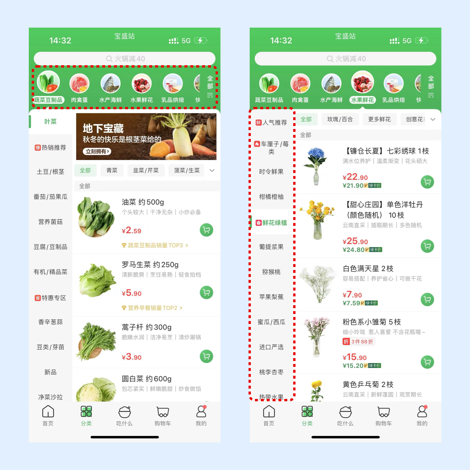 在叮咚买菜的分类中,可以看到页面顶部有横向的tab导航,在每个tab下又有多级分类菜单做导航,用户可以选择具体的商品。