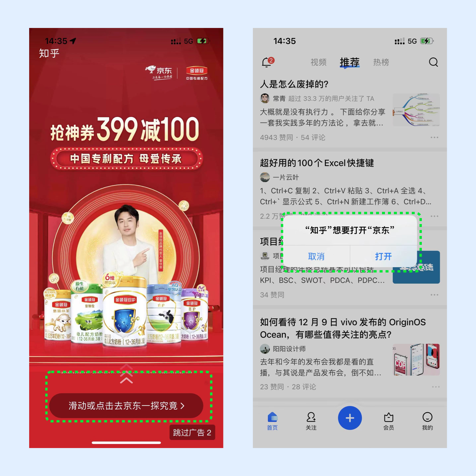 启动知乎后会看到广告闪屏,在读秒进入首页的时间内,页面底部有提示滑动或点击区京东一起探究这样的广告跳转的提示,点击后提示跳转到广告目标产品中。
