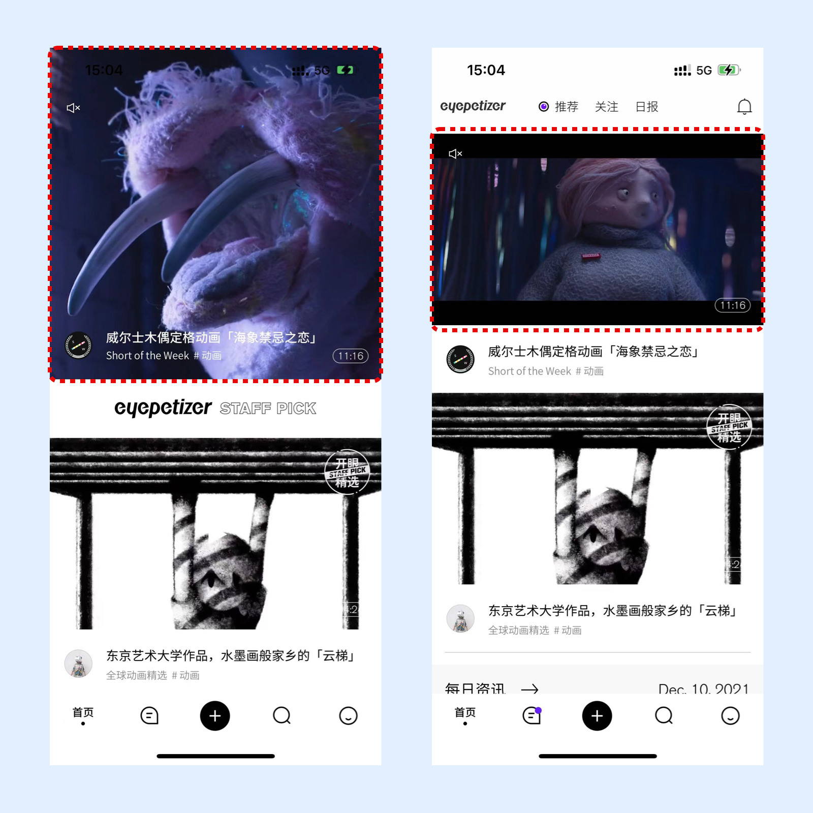 进入开眼后,可以看到banner位是通栏的半全屏大小,在浏览内容后返回头部广告位则与内容区视频尺寸相同。