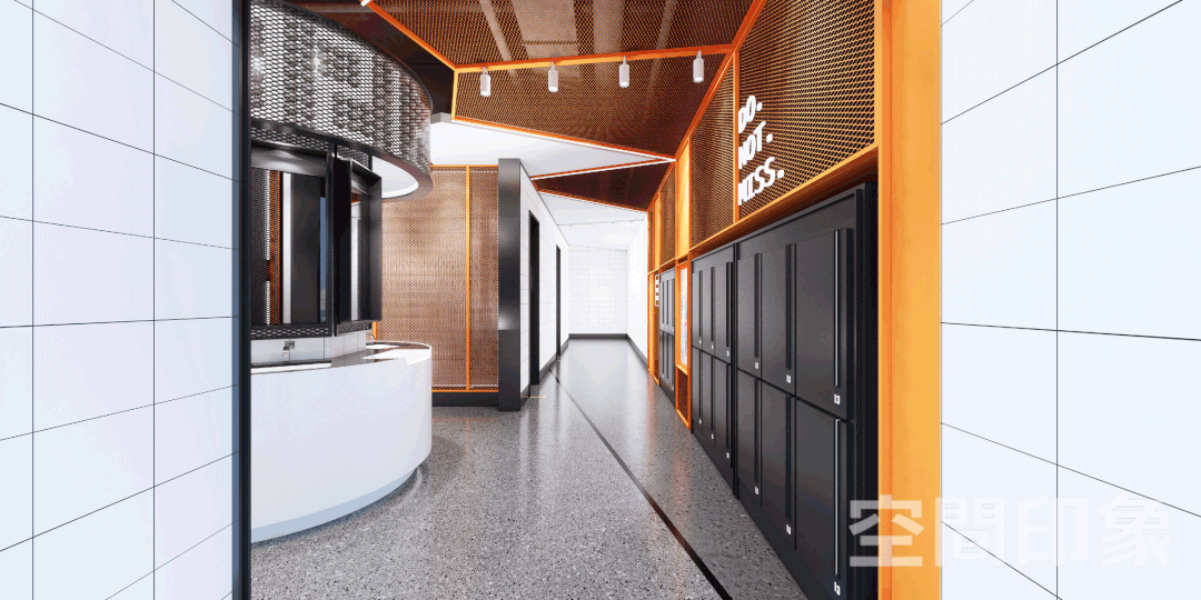 对应“拼”区域,在“技”节点中,网球是主要的设计元素,天花以不同的橙色冲孔铝板搭配多样的Slogan装饰,营造出年轻活力的空间感。