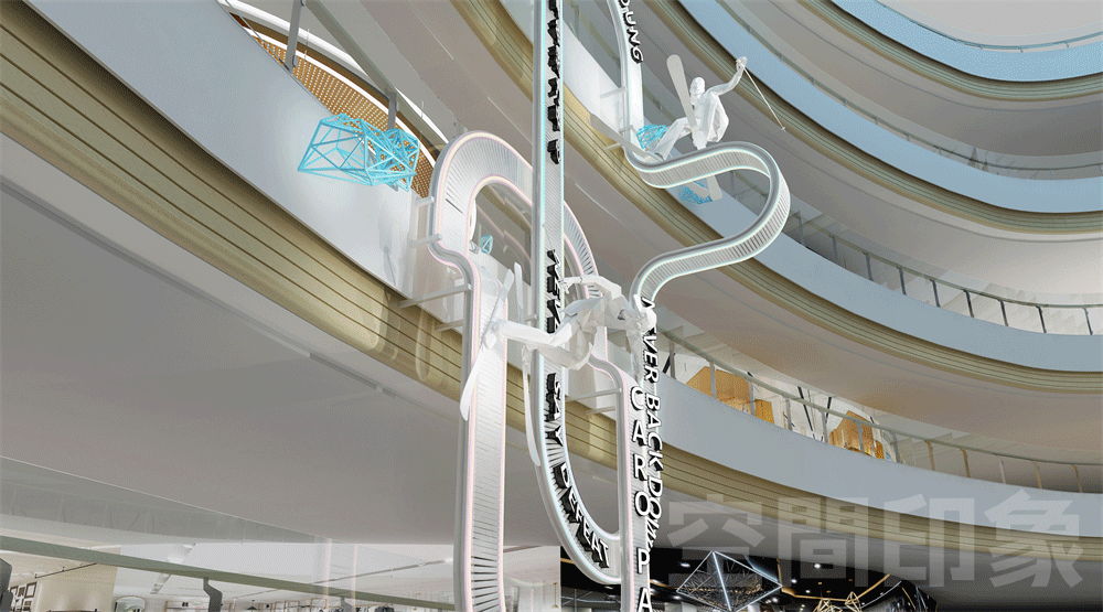 走进主入口,引入眼帘的是一座2跨4的超大速滑道装置,我们以滑雪这项“限定运动”致敬沈北人民,通过时下青年热衷的极限运动表达出空间主题。