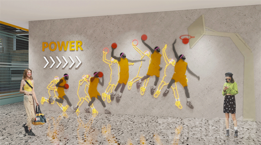入口处,运动员以帅气的“倒扣上篮”动作,宣告其区域主角“篮球”的主场属性。前卫新颖的画风,融合酷炫的红黑色调,营造出有范儿的街头场景氛围,通透的围栏也为消费者创造出更多的娱乐互动空间。