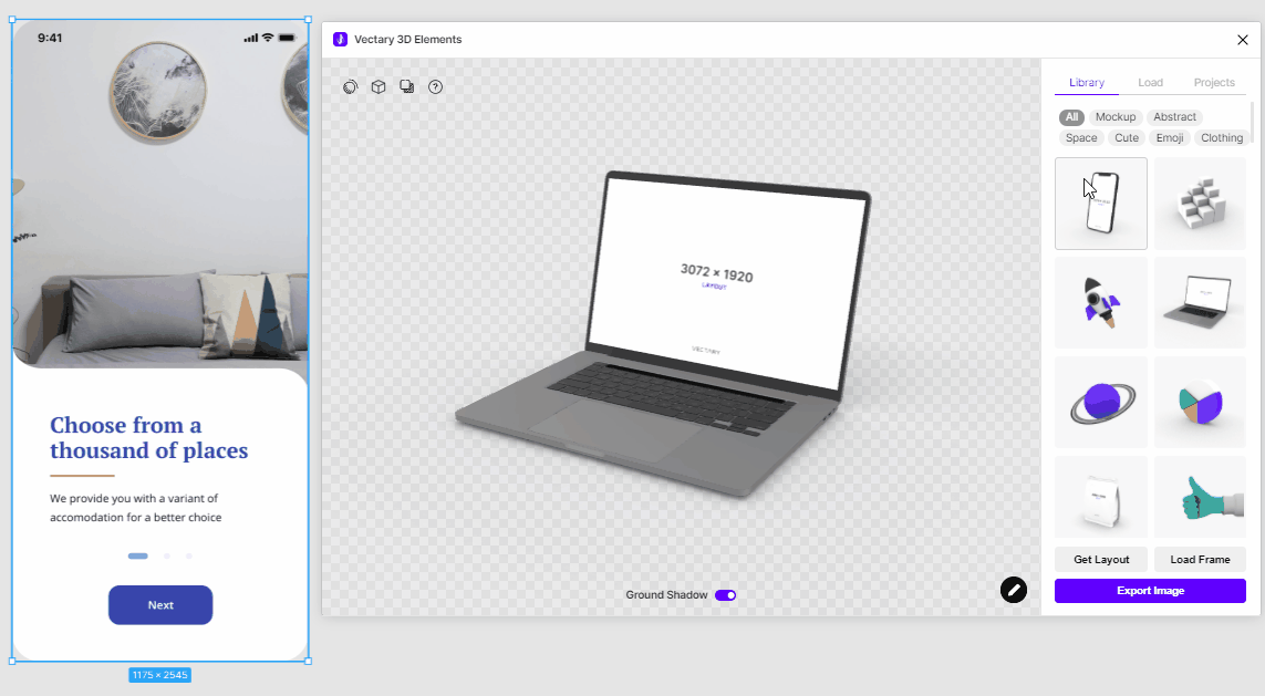 Vectary 3D 是值得 UI 设计师人手下载一个的真机展示插件, 可以按需选择如手机电脑等3D模型,点选希望展示的 Frame 添加到 3D 的画布当中,调整好模型的角度和大小,就可一键生成ui界面与真机交互的图片。