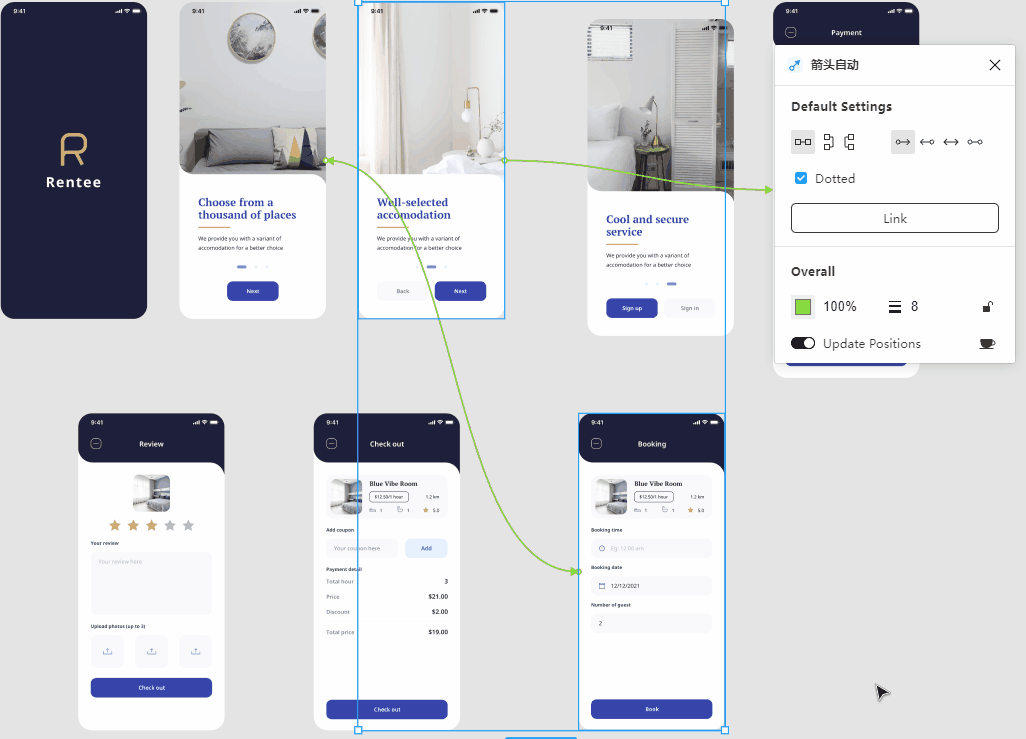不管是界面的状态图,还是想要展示设计稿之间的交互关系,都需要用到流程图连线功能。