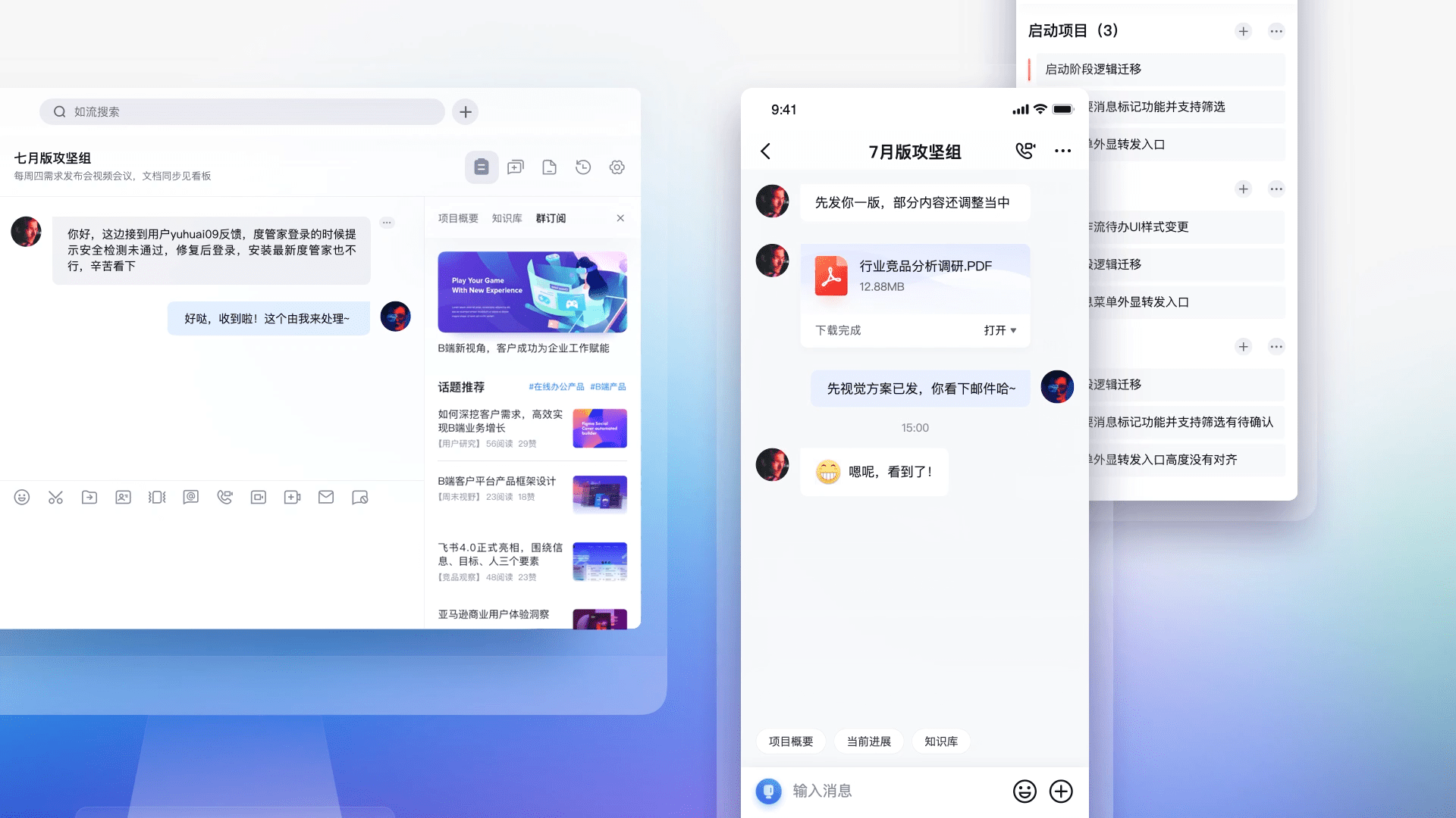 传统IM的沟通方式由于信息的分散,大家不断的打字发消息、 复制发链接,打包传文档,亦或者同时打开多个窗口协同操作。整个过程繁杂冗长,工作成本高,效率低,所以设计需要在人和信息之间建立更短的连接路径,实现信息的高效协同和共享。此次升级我们从交互架构层针对im沟通场景提出了智能看板的架构理念,将重要的协同信息,通过群聊的智能看板能力与群参与人触达,实现更紧密的协同互动。同时,在知识库场景,我们构建了更即时临场的互动评论能力,实现在线编辑场景的即时沟通高效协同。