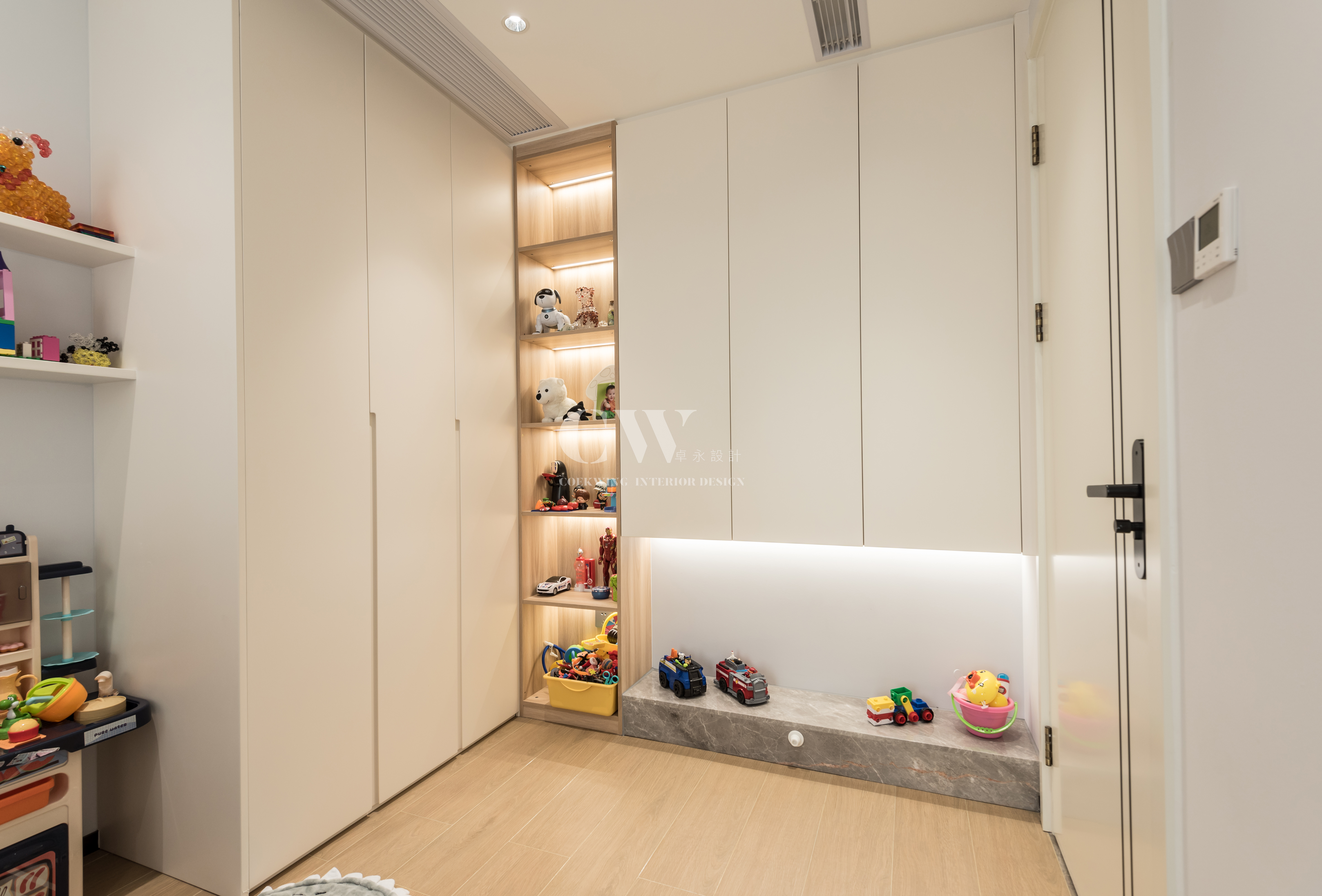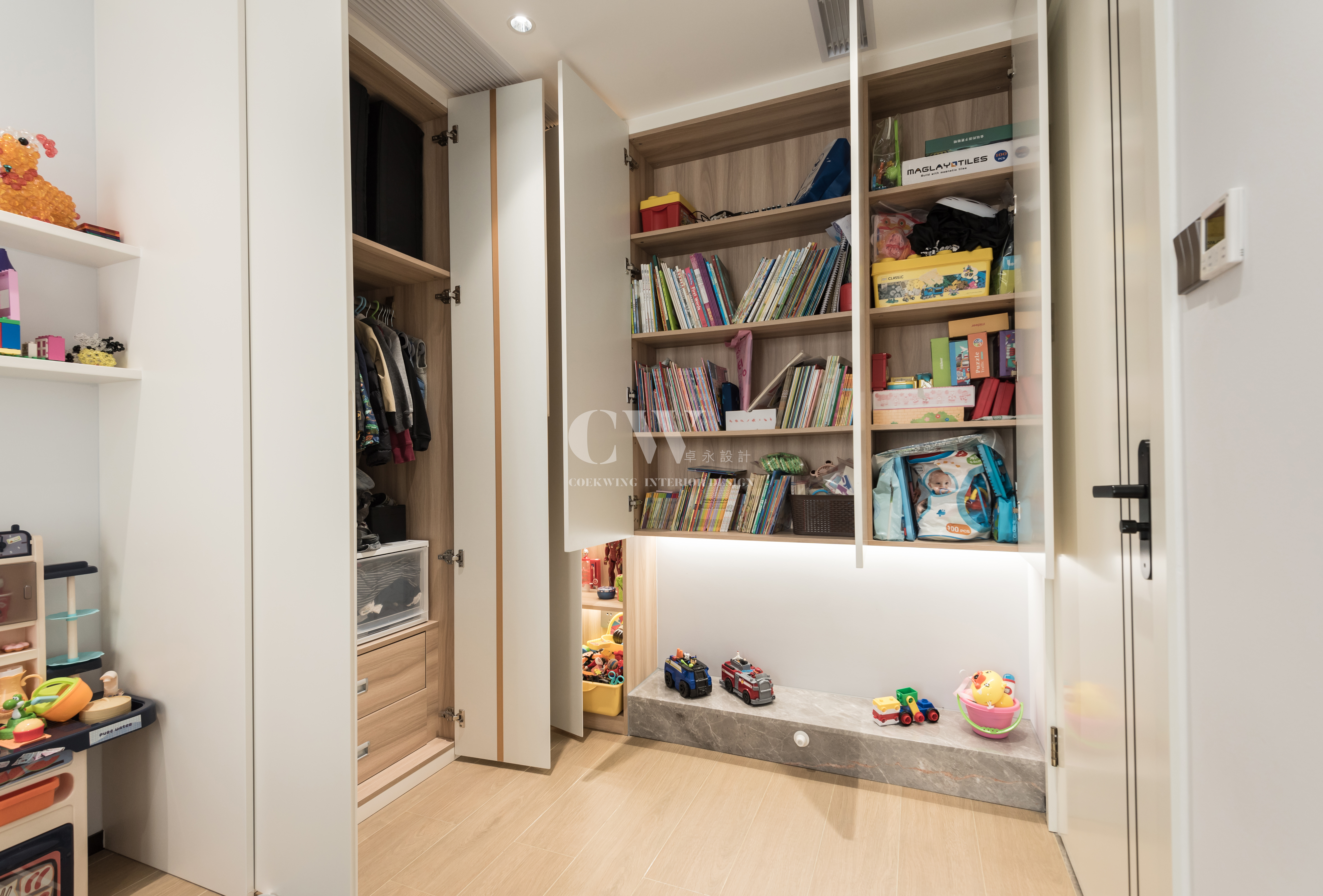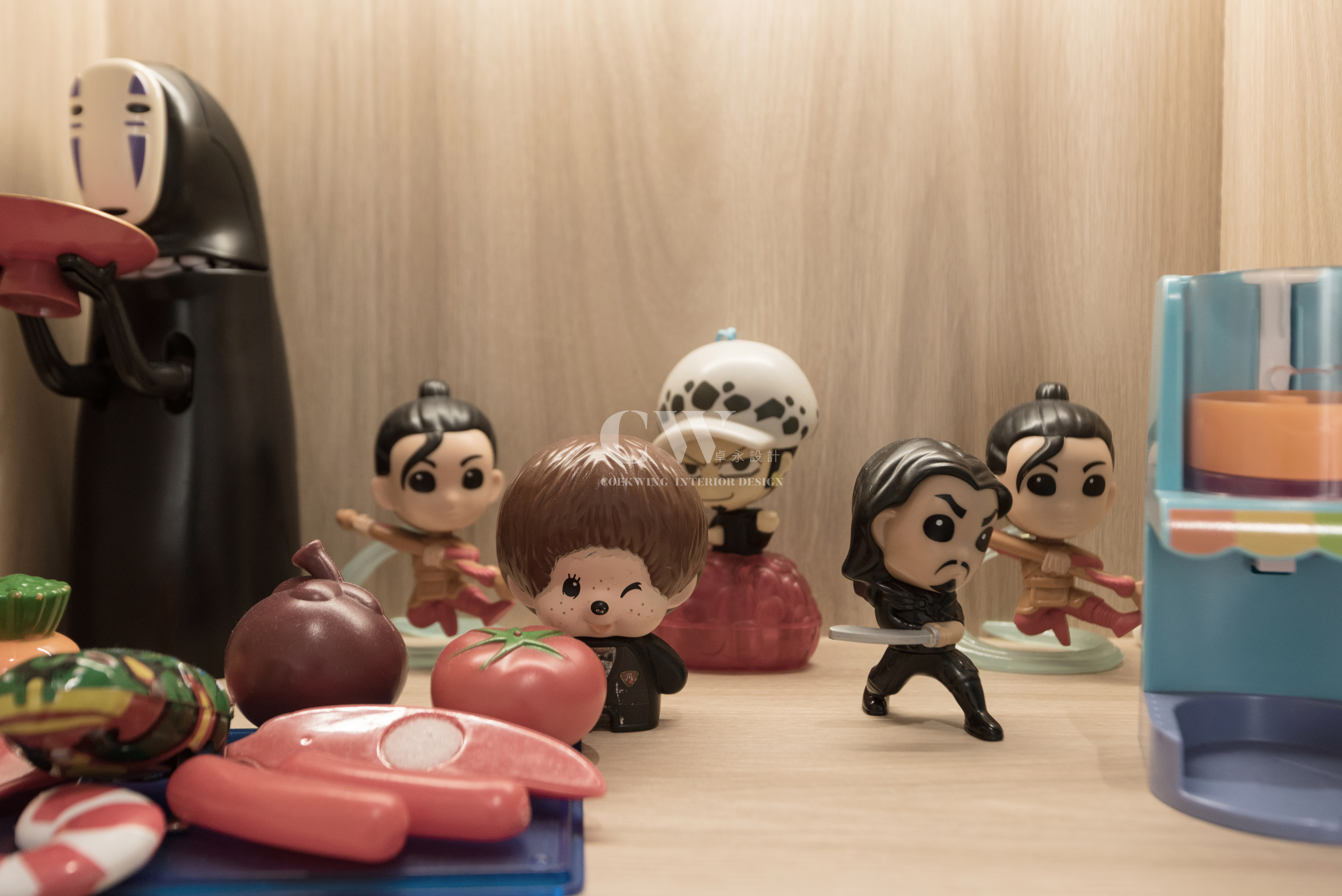 是玩具展示櫃、是手辦臺、是書架、是收納櫃、是衣櫥,百變的儲物空間,是靈活的規劃,極簡的色塊組合,木,石的運用是和諧的空間美學。