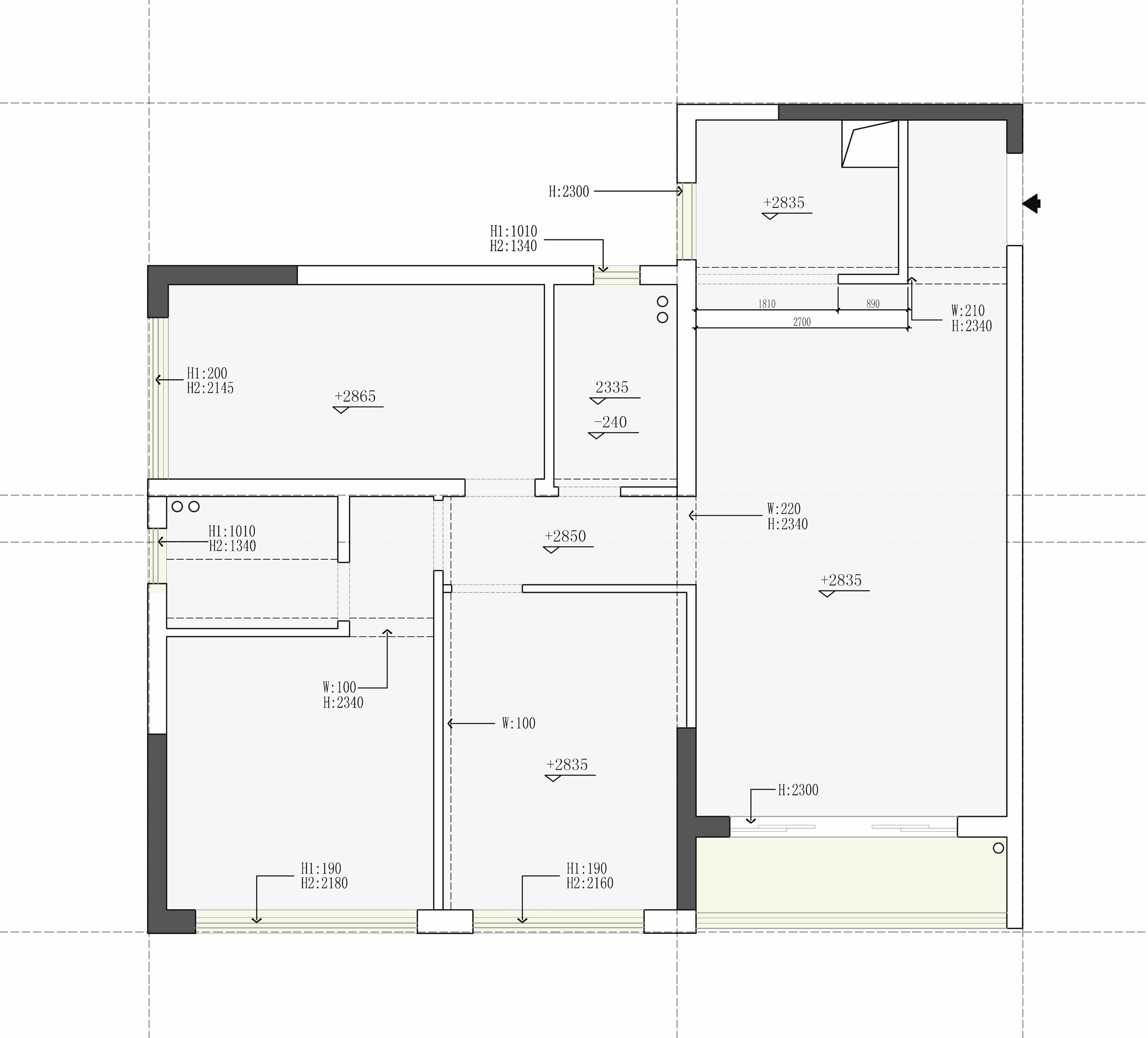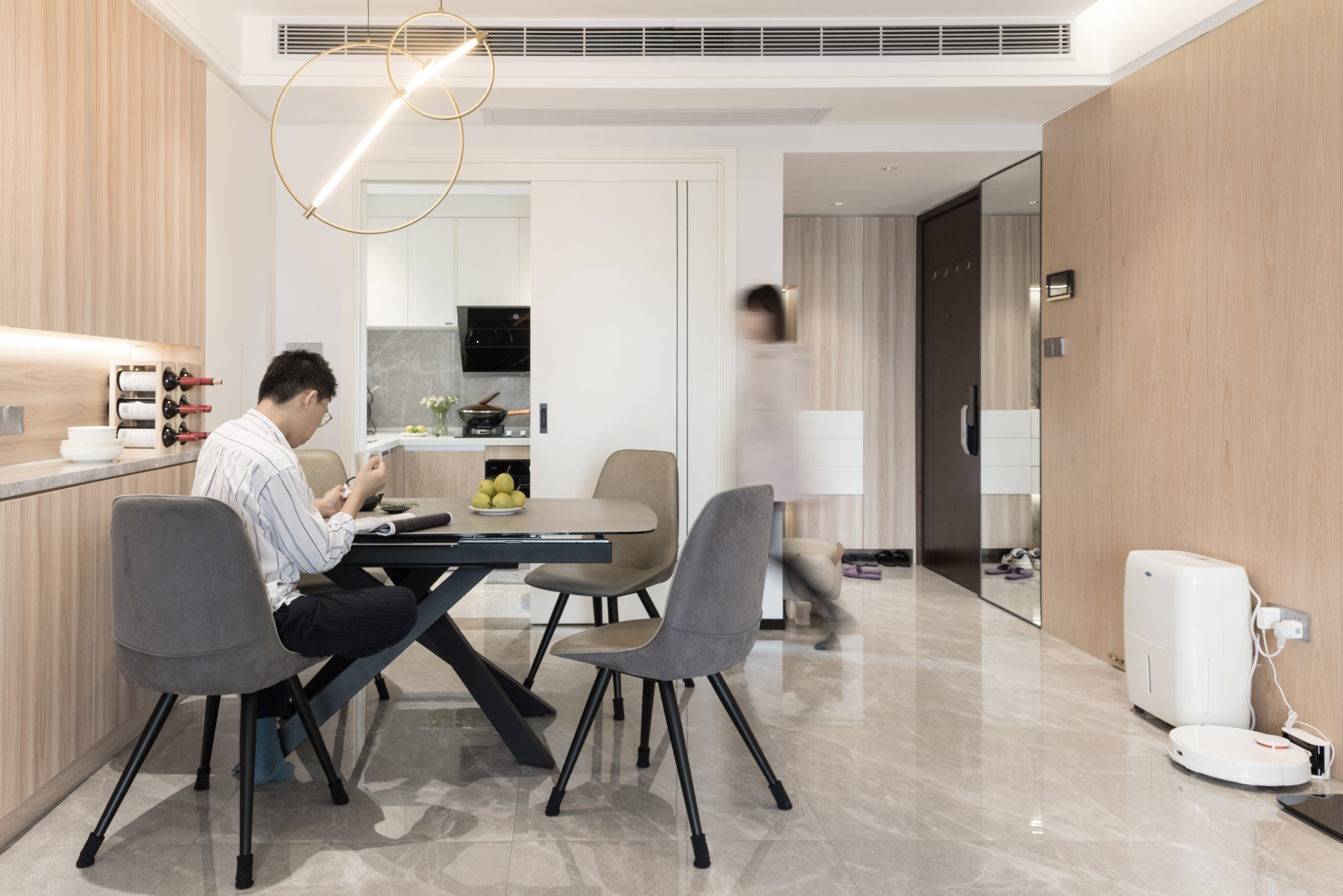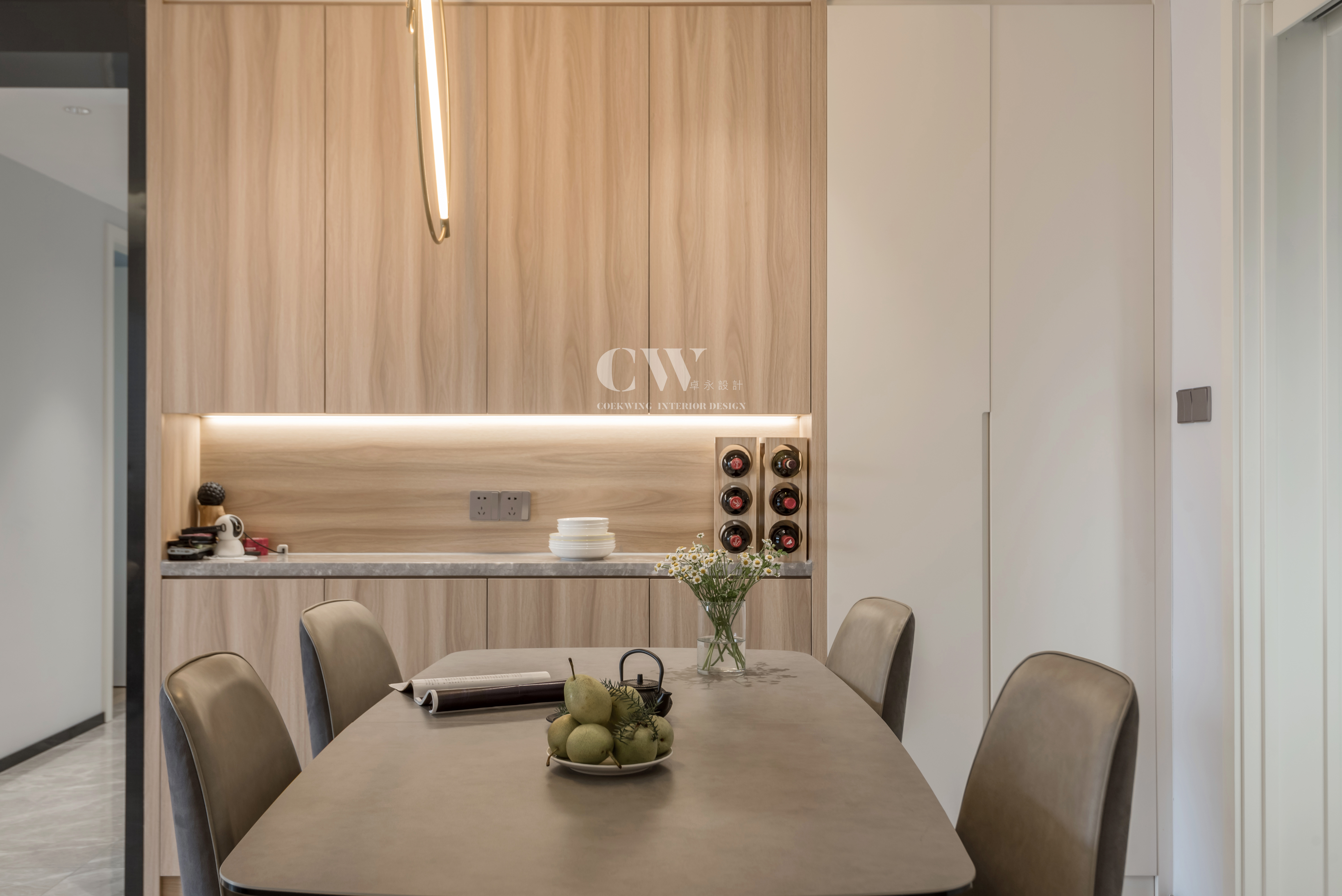 就餐空間使用大面積、形態不均的色塊打造層次,用大面積錯開的白色與木飾面板塊提升視覺縱深美感,高級的灰色石材大面積的地面運用帶來沉穩的質感,也讓視覺層次與空間擴充得到最大化的體現。