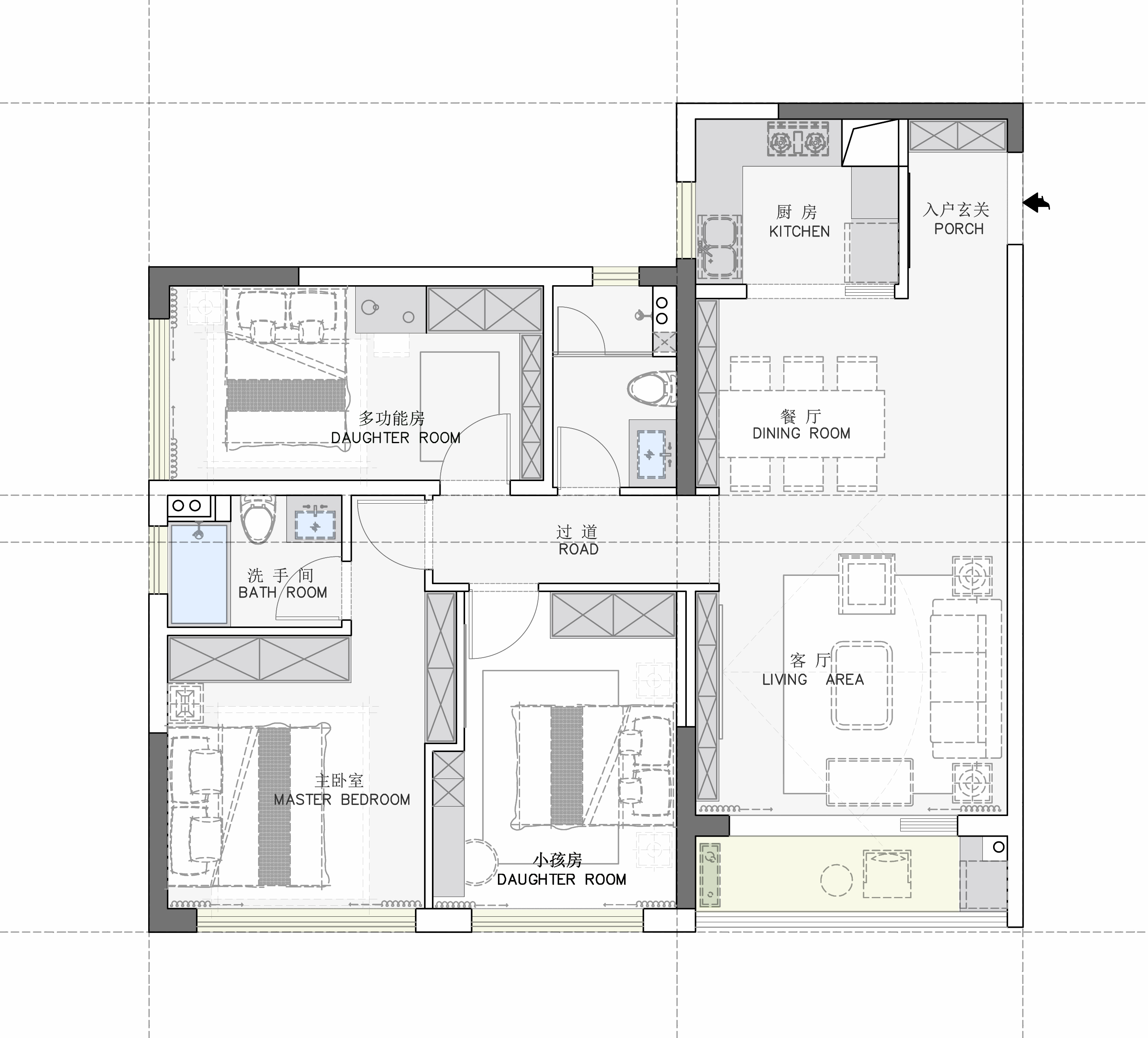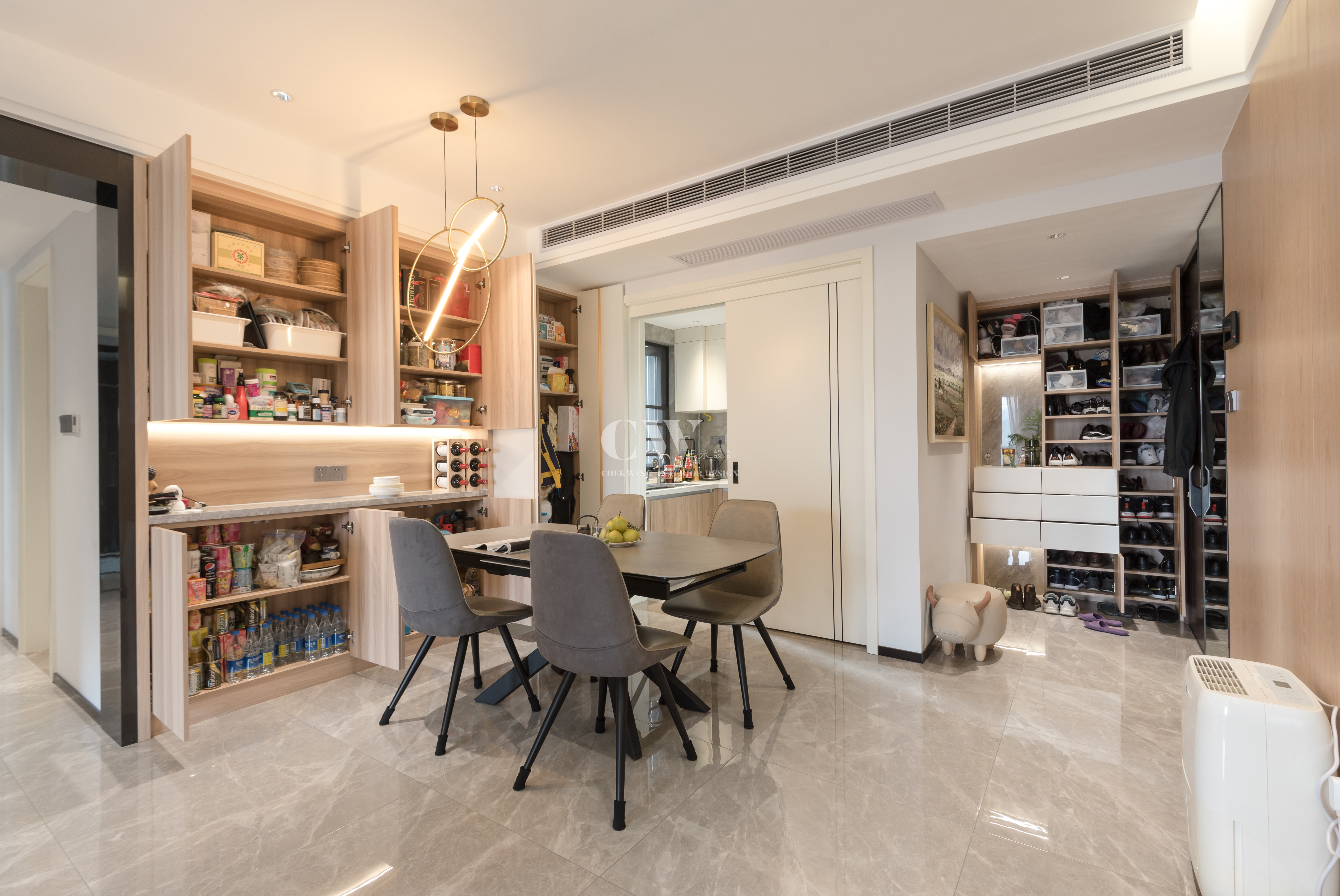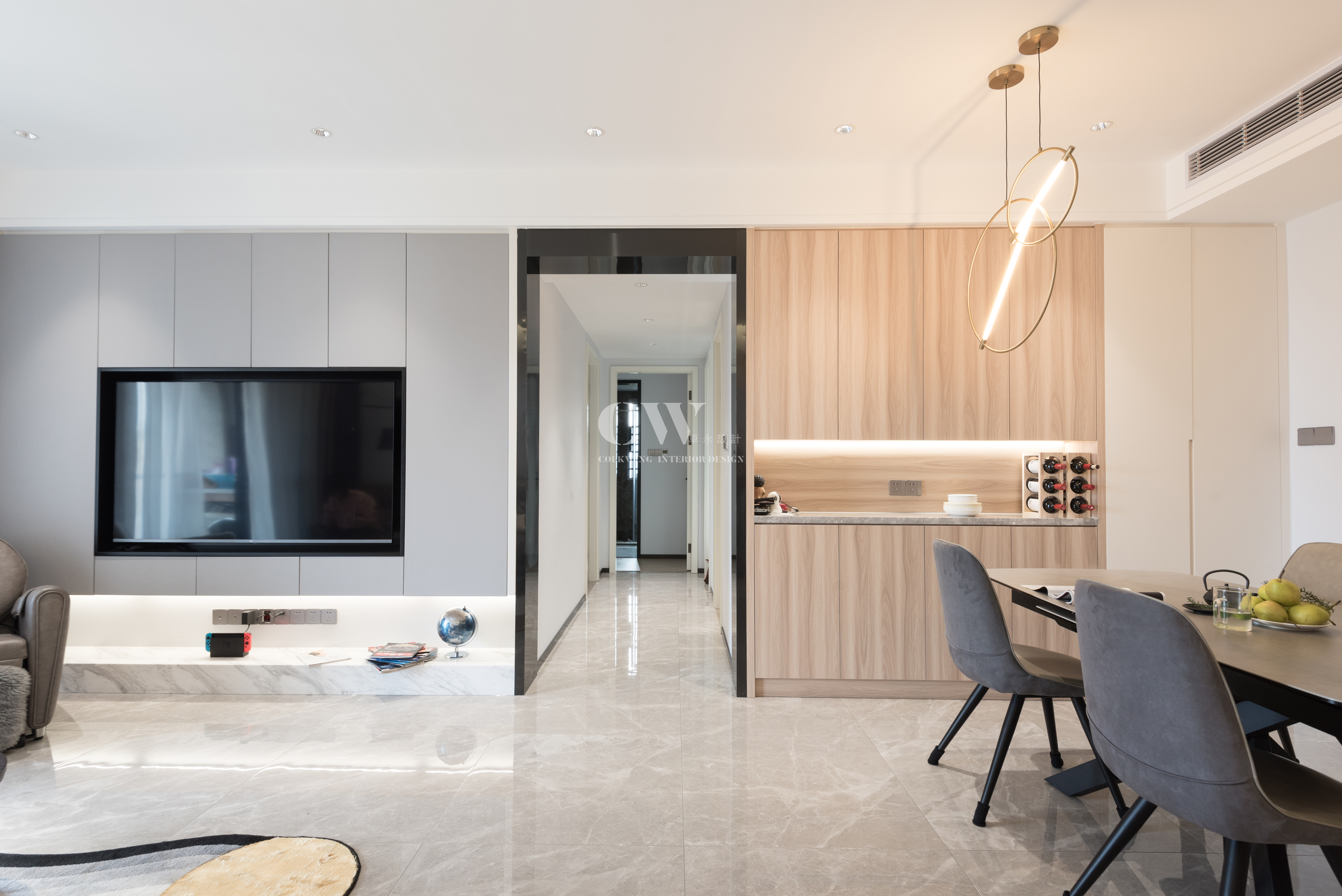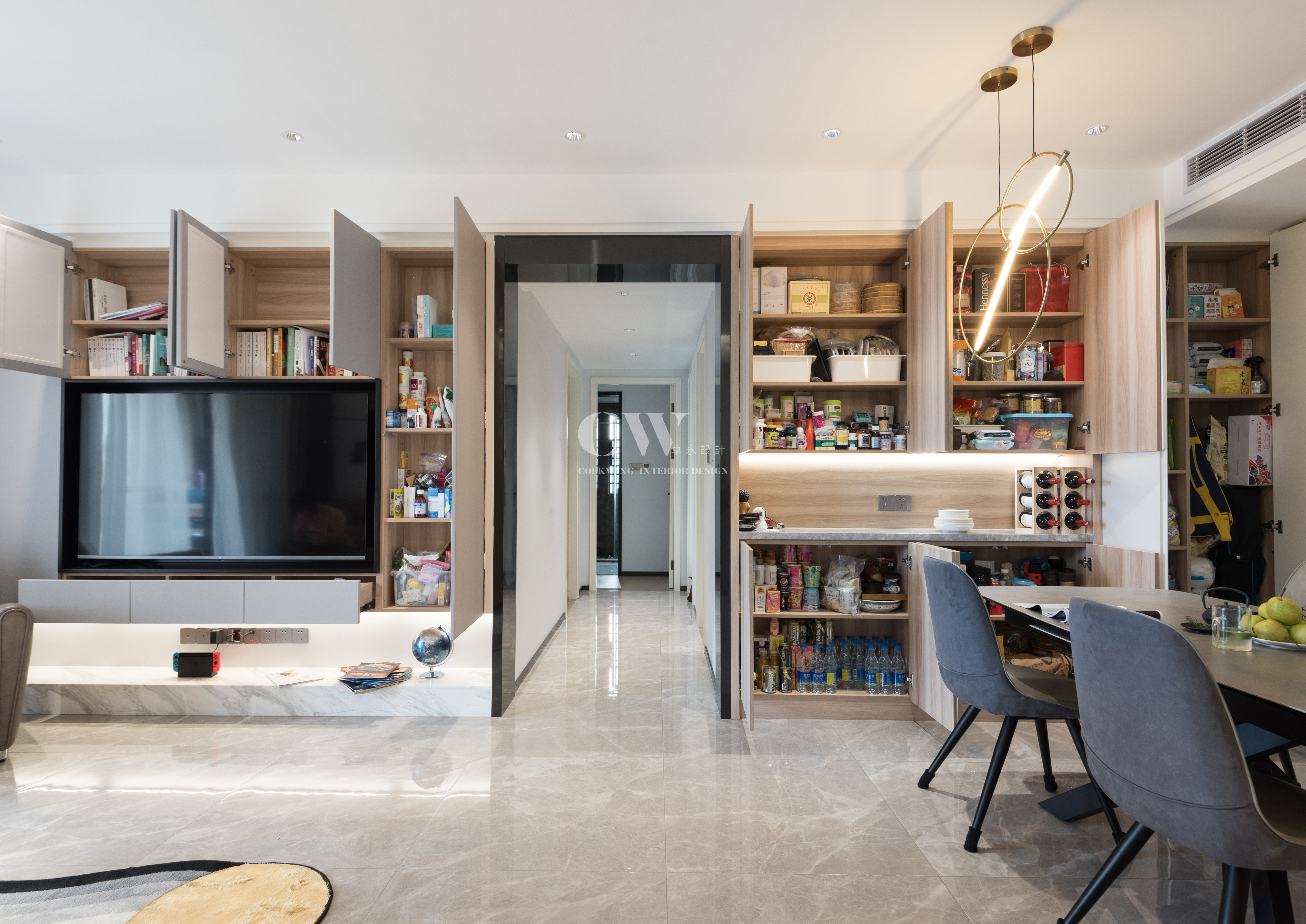 綜合多年的私人住宅設計經驗,設計師運用裝飾牆的空間做了大面積的暗藏式收納設計,結合華人的生活習慣,將“物有所歸”的概念運用在區域的劃分設計,有利於區域用品的使用及歸類;這也是創造良性生活習慣的方式。