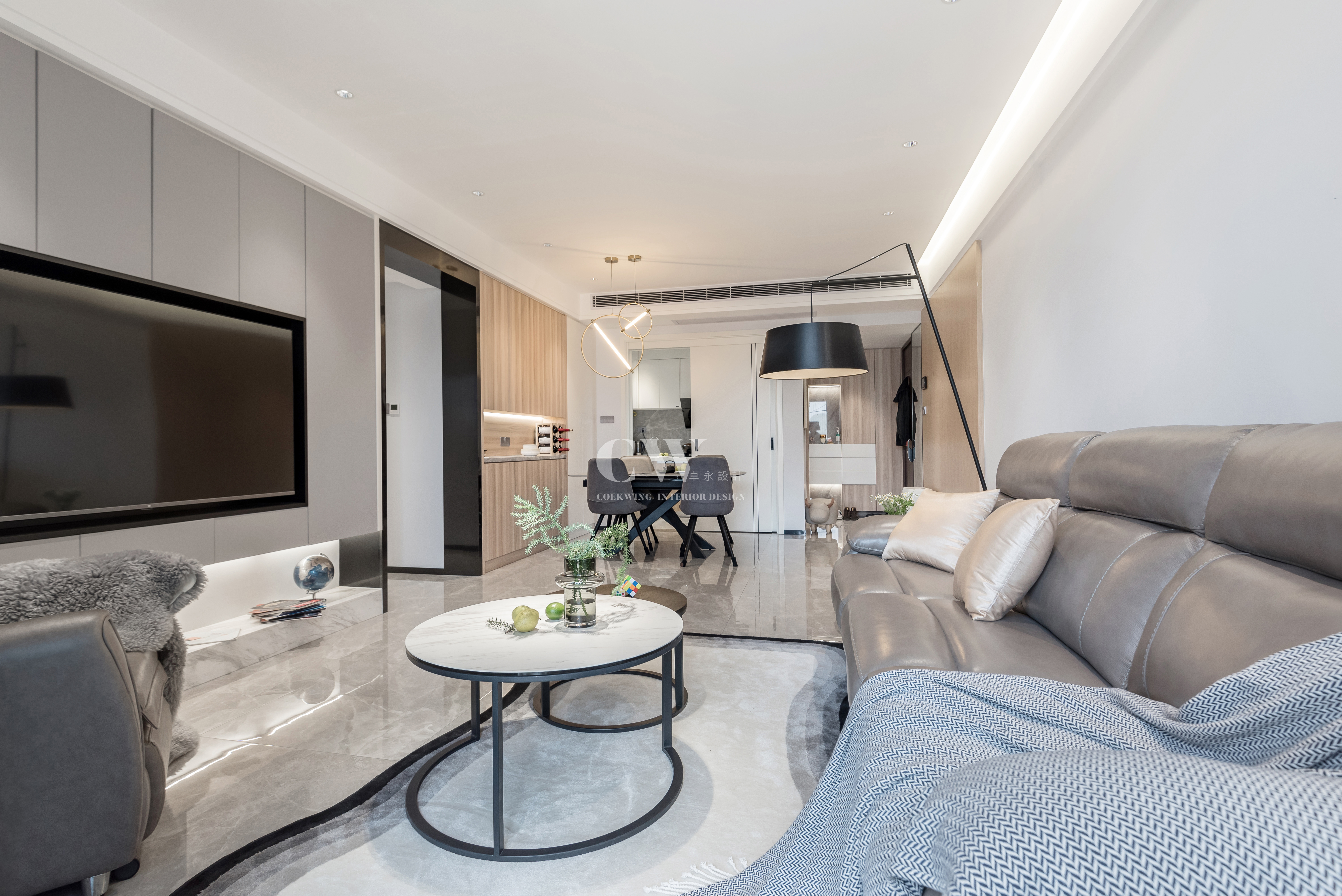 配色飾面以頗爲現代的手法鋪設,石、木與皮革爲空間奠定高級的灰色調,沙發、地毯、餐椅則以之爲基點創造色彩統一的整體性。以點、線、面的運用使得整個客餐廳背景牆形成寬坦而流暢的連貫性。