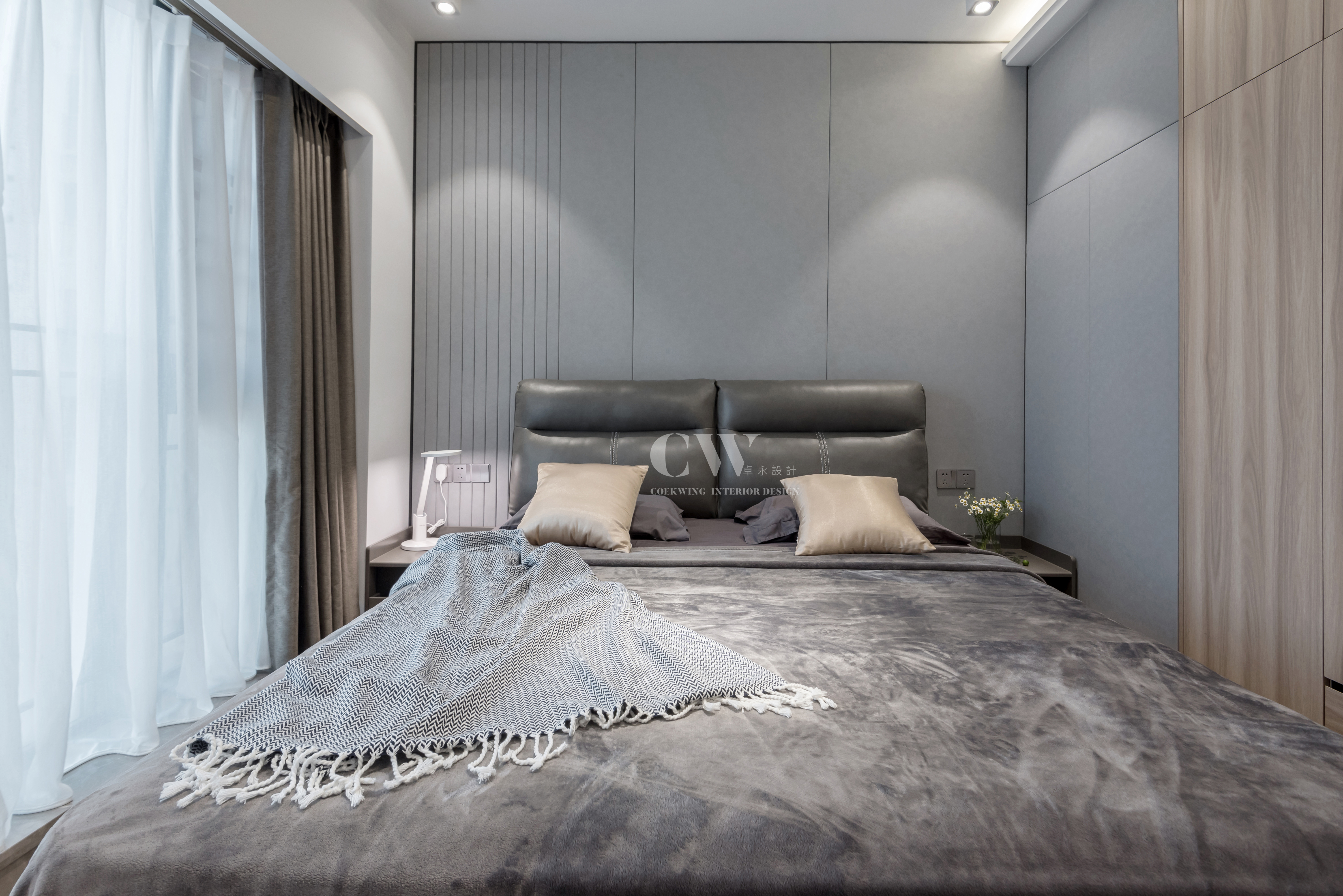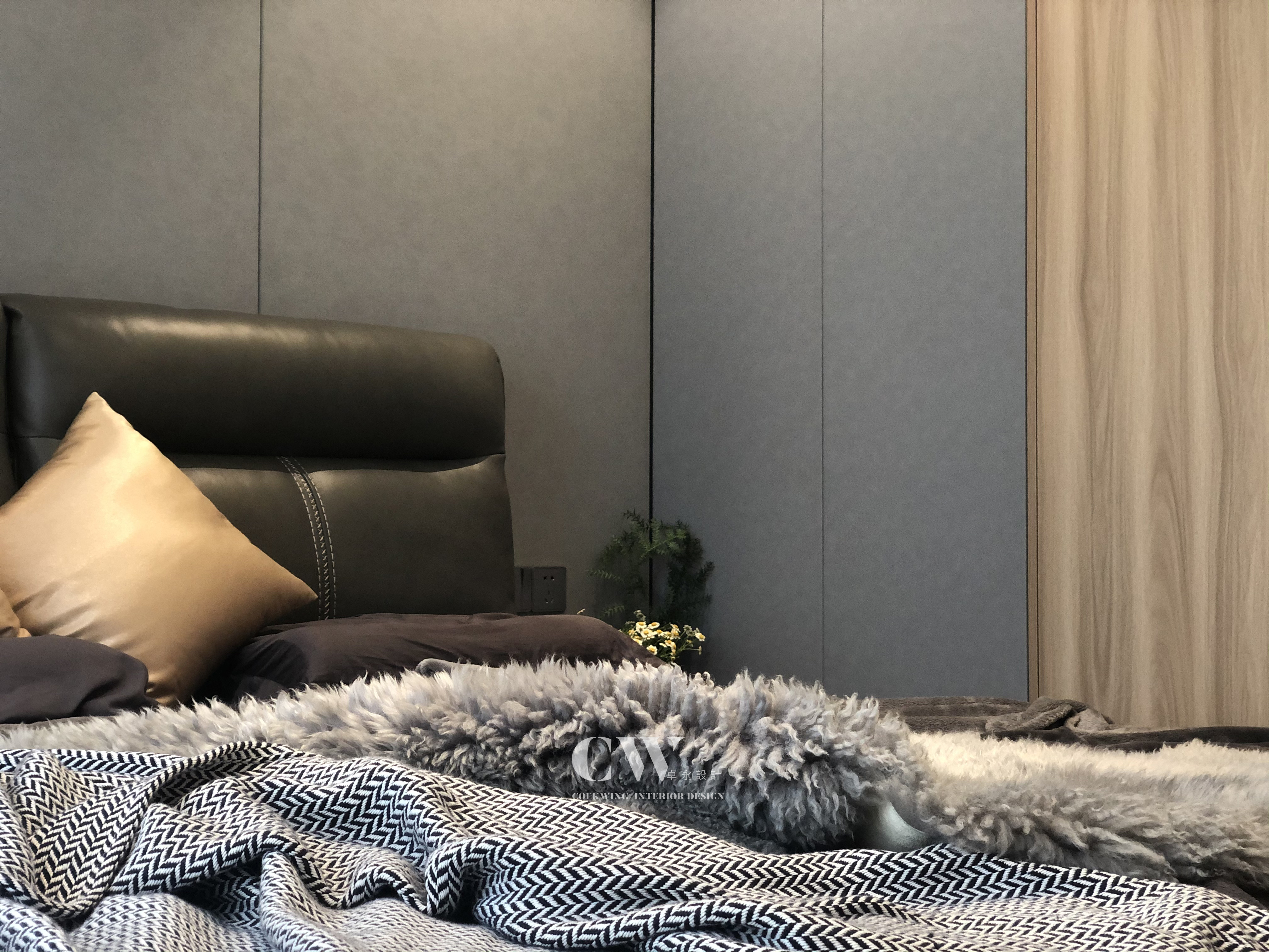 以假亂真的設計手法,在有限的空間讓衣櫥進來吧,它可以是床頭背景牆的一部分,色塊的鬼馬運用,極簡線條的跳躍是恰到好處的。它是櫃門也是屏風。做舊皮革與木面的表現,是和諧整體的表達。高級灰的色系,是安靜療愈的考究。