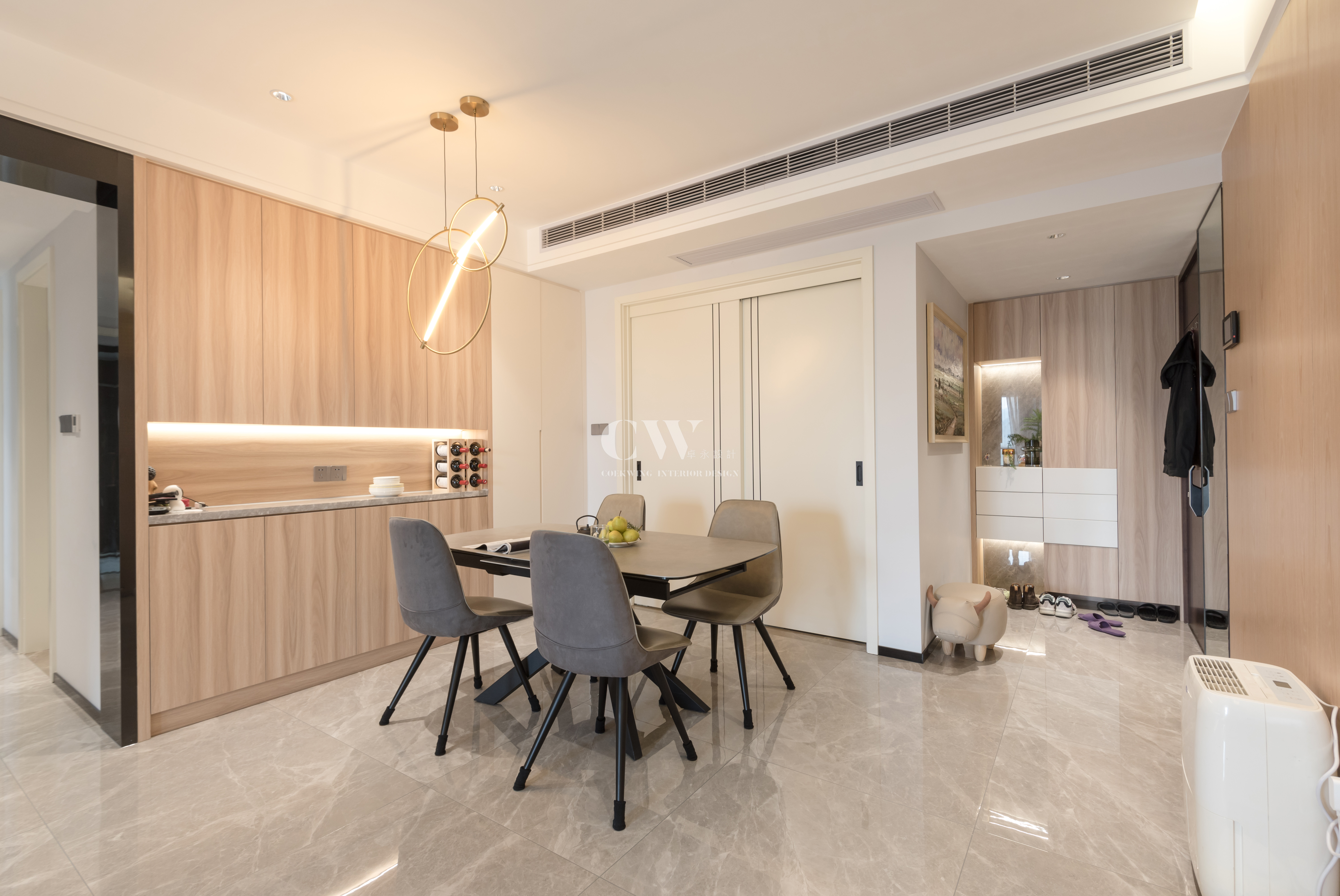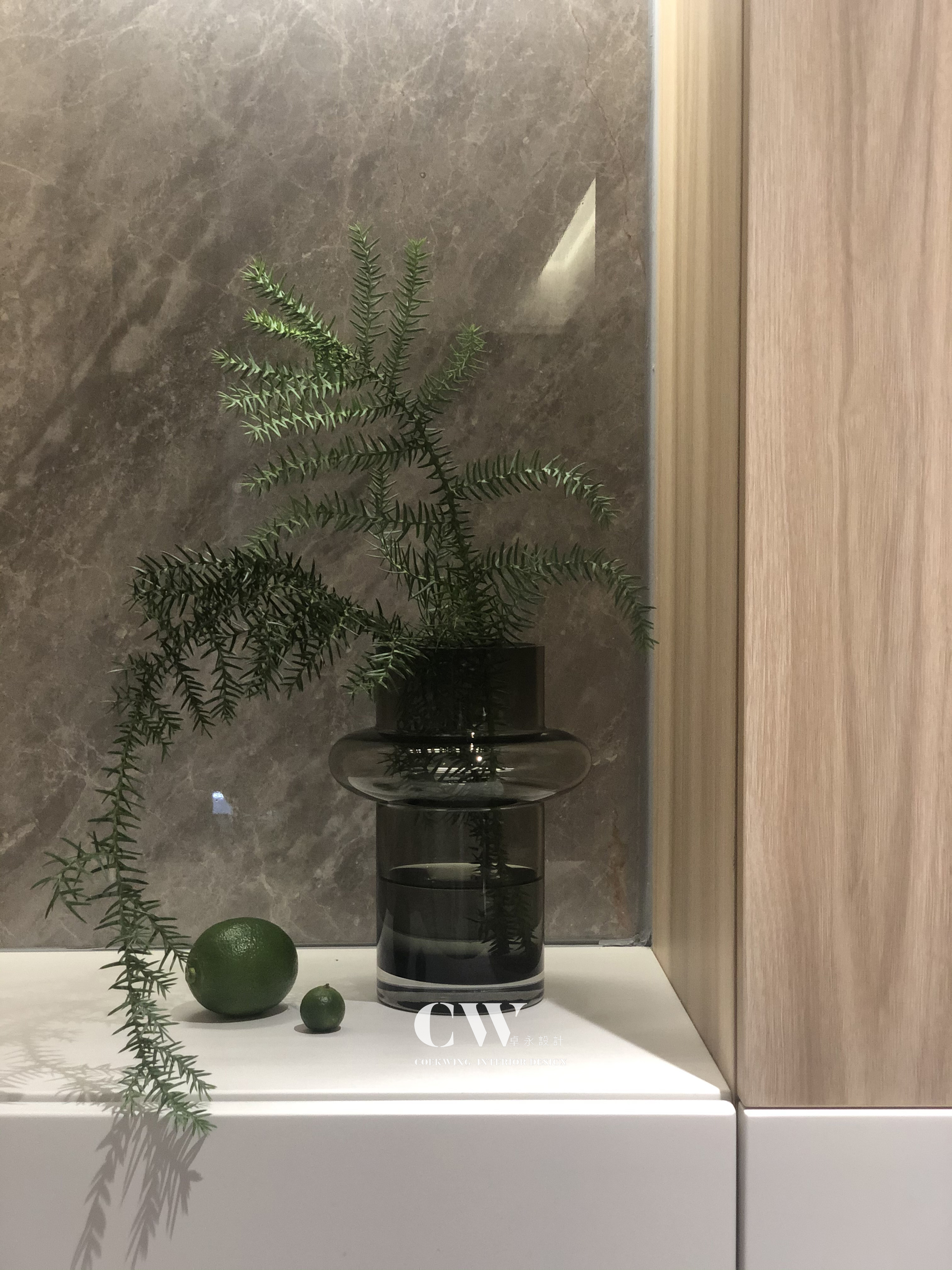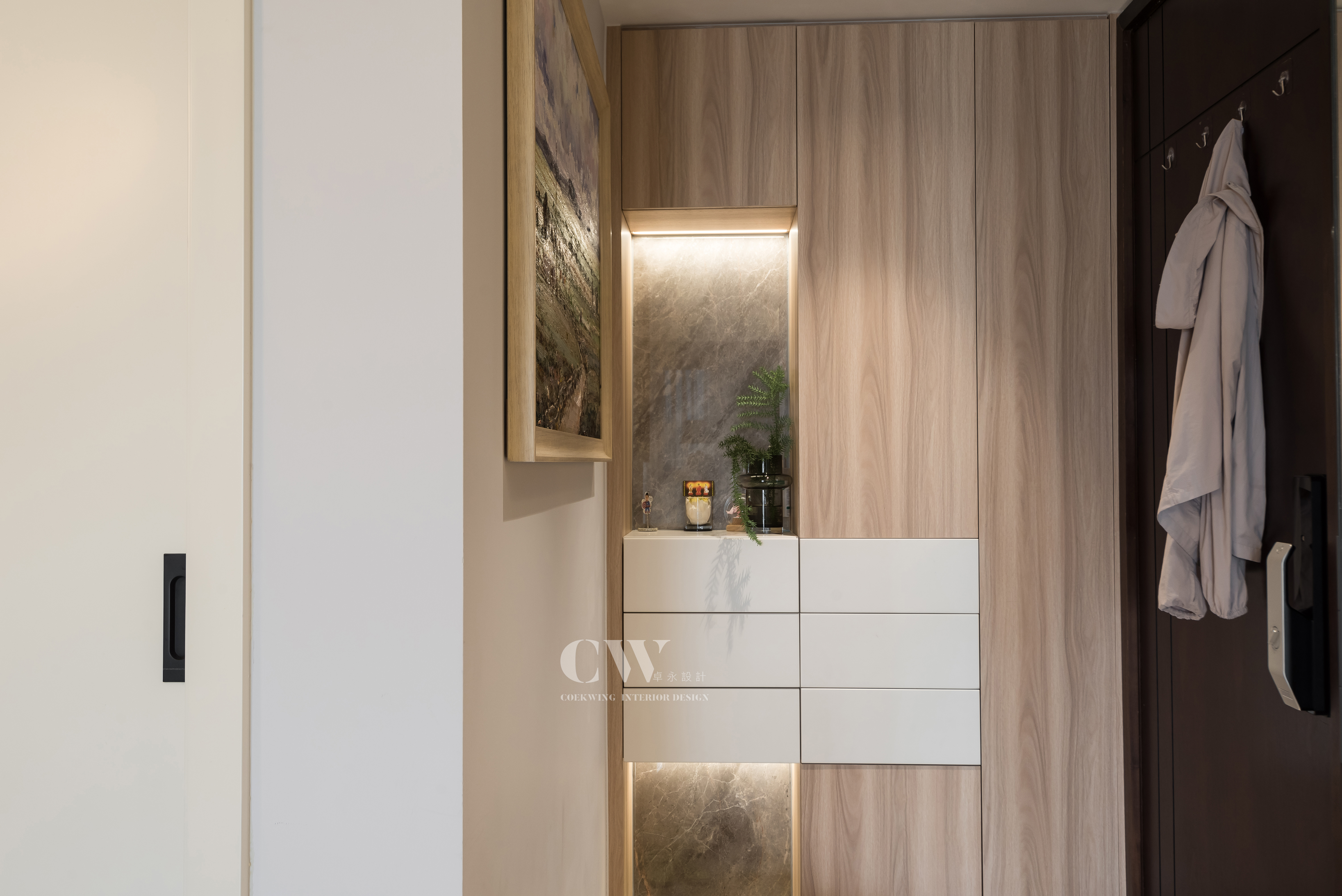 在有限的空間創造更多的可能,除了滿足收納的功能性,創造景觀牆是靈活和視覺觀感的表達,鞋櫃表面運用雲灰石與樺木飾面的結合穿插出一份視覺的層次,啞白色的烤漆色塊加強了空間的反差效果,打破了呆板的氣氛。