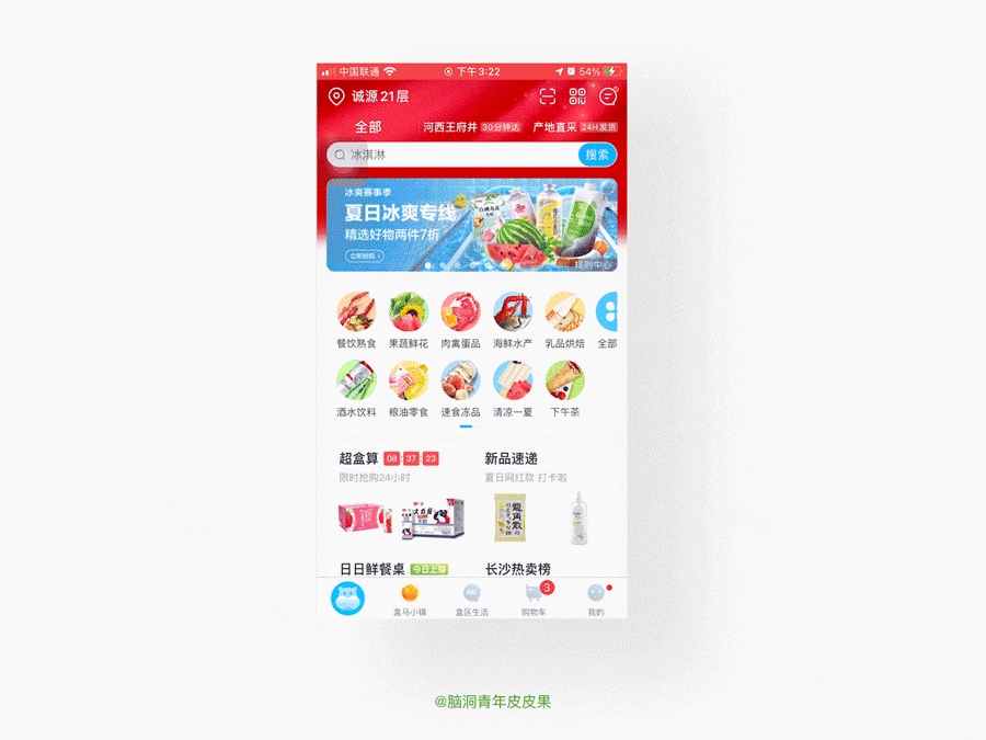 用户进入盒马时,二楼的功能会自动弹开,一段时间后隐藏。