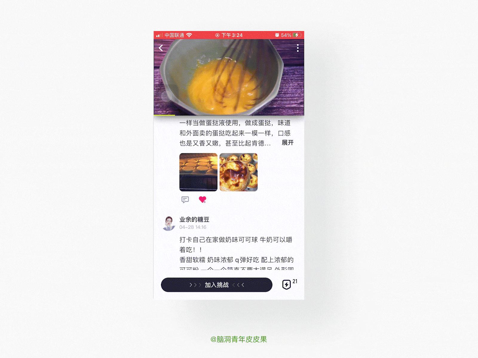 “加入挑战”作为有噗的主功能,按钮始终显示在下方易触及区域,且视觉显眼,同时增加动效引导,进一步增强用户点击欲望;点击之后,会有一系列像彩带和飘带似的效果串出来,效果结束之后,上方弹出“您已成功加入该挑战”弹窗。