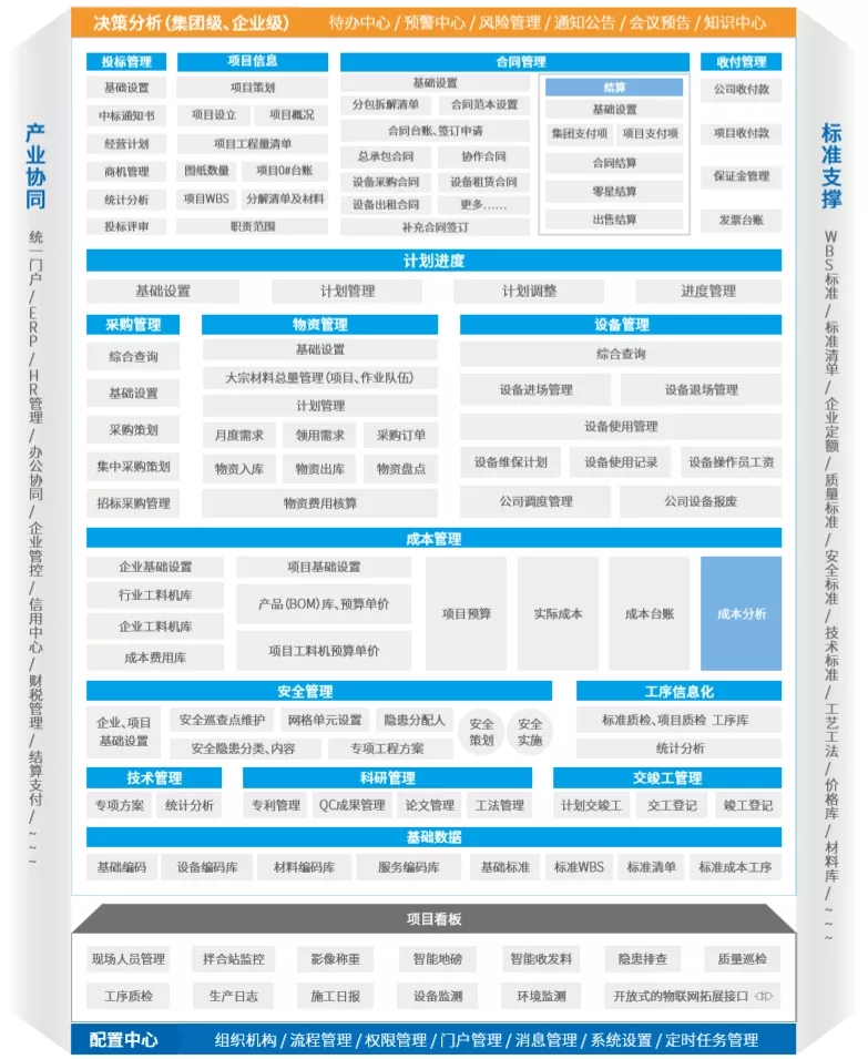 产品涵盖采购管理、供应商管理、协作单位管理、计划进度、合同管理、设备管理、物资管理、成本管理、安全管理、质量管理、技术管理、交竣工管理等业务模块,全面的业务功能和范围,与施工现场管理、产业协同、企业标准形成科学有效的互联互通关系。