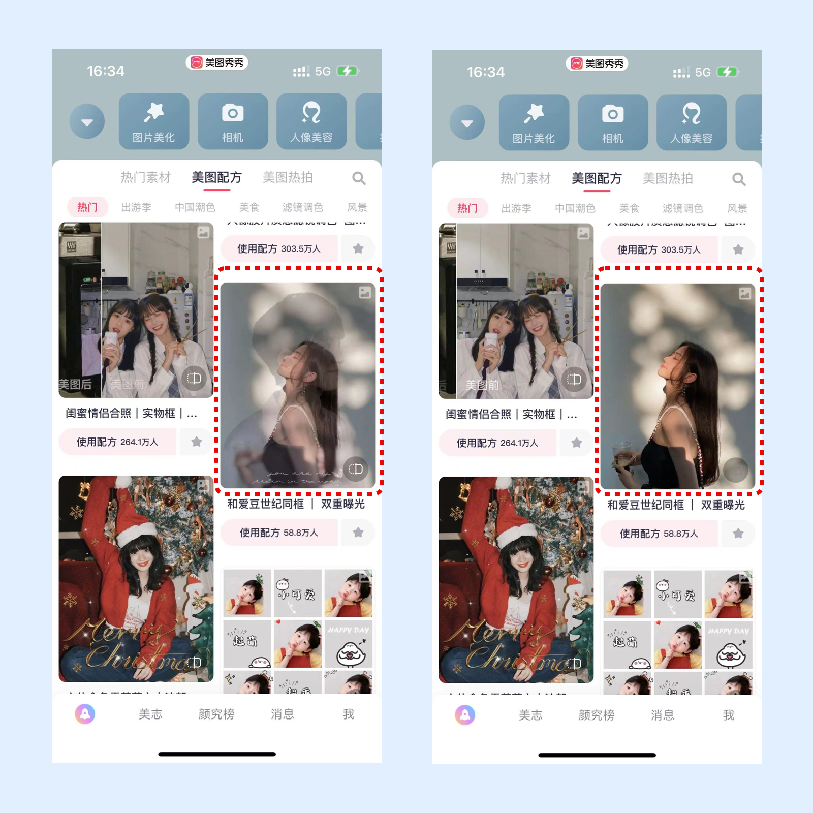 进入美图秀秀后,首页向下浏览内容,在用户发布瀑布流列表中,一下图为例,缩略图右下角会有一个icon,没有点击时显示使用特效图片,点住按钮可以看到无特效照片。