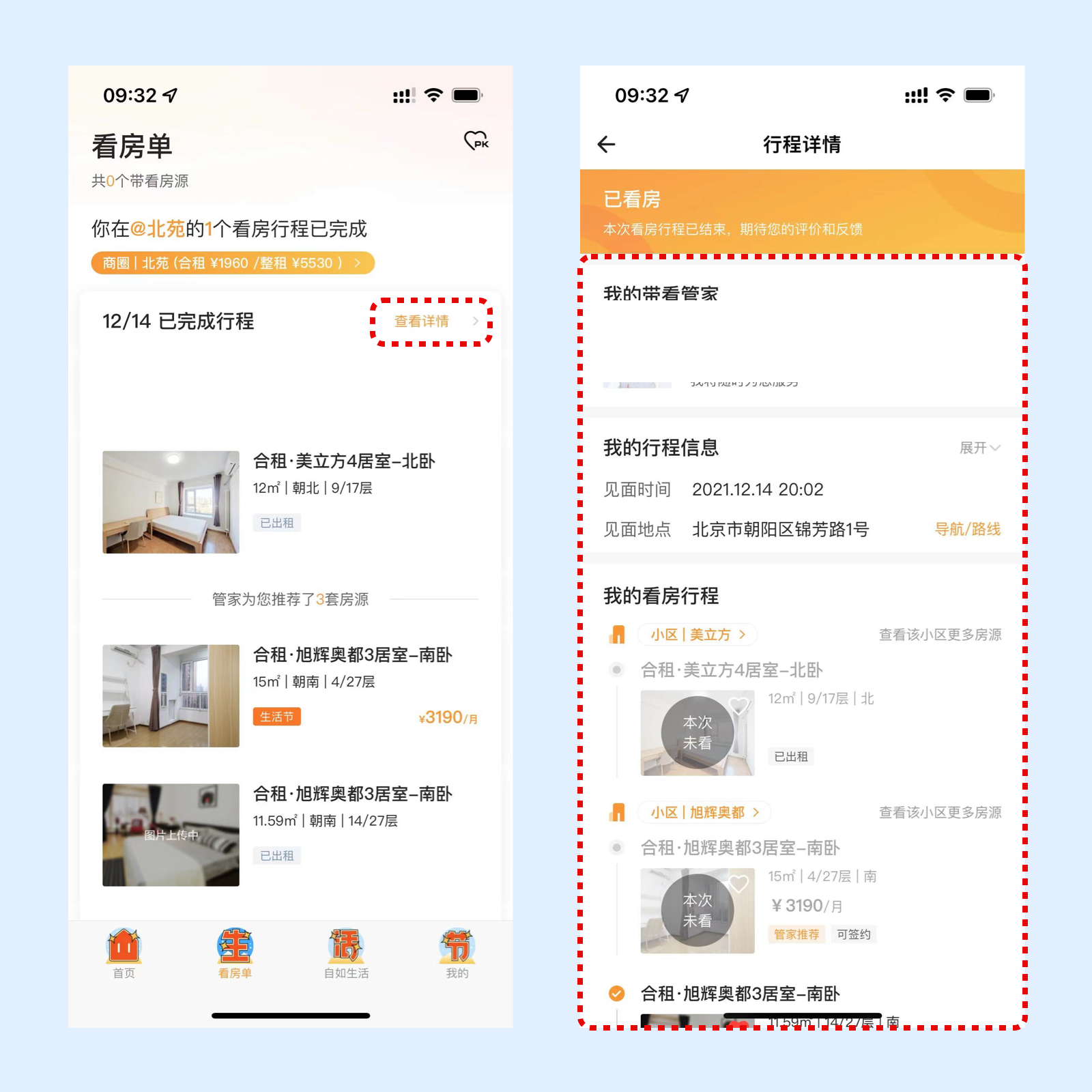 打开自如后,在底部第二个标签中,可以看到改成了看房单,用户在里面可以看到自己所去看过的房间、行程。