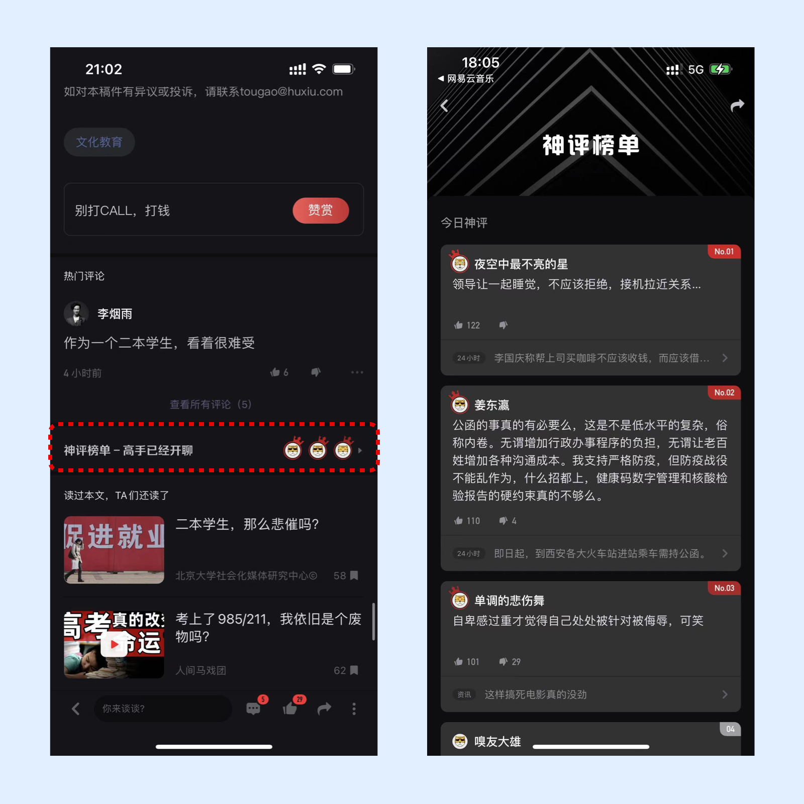 在虎嗅中阅读文章,文章阅读完成之后是评论框,再之下是神评榜单,点击进入详情。