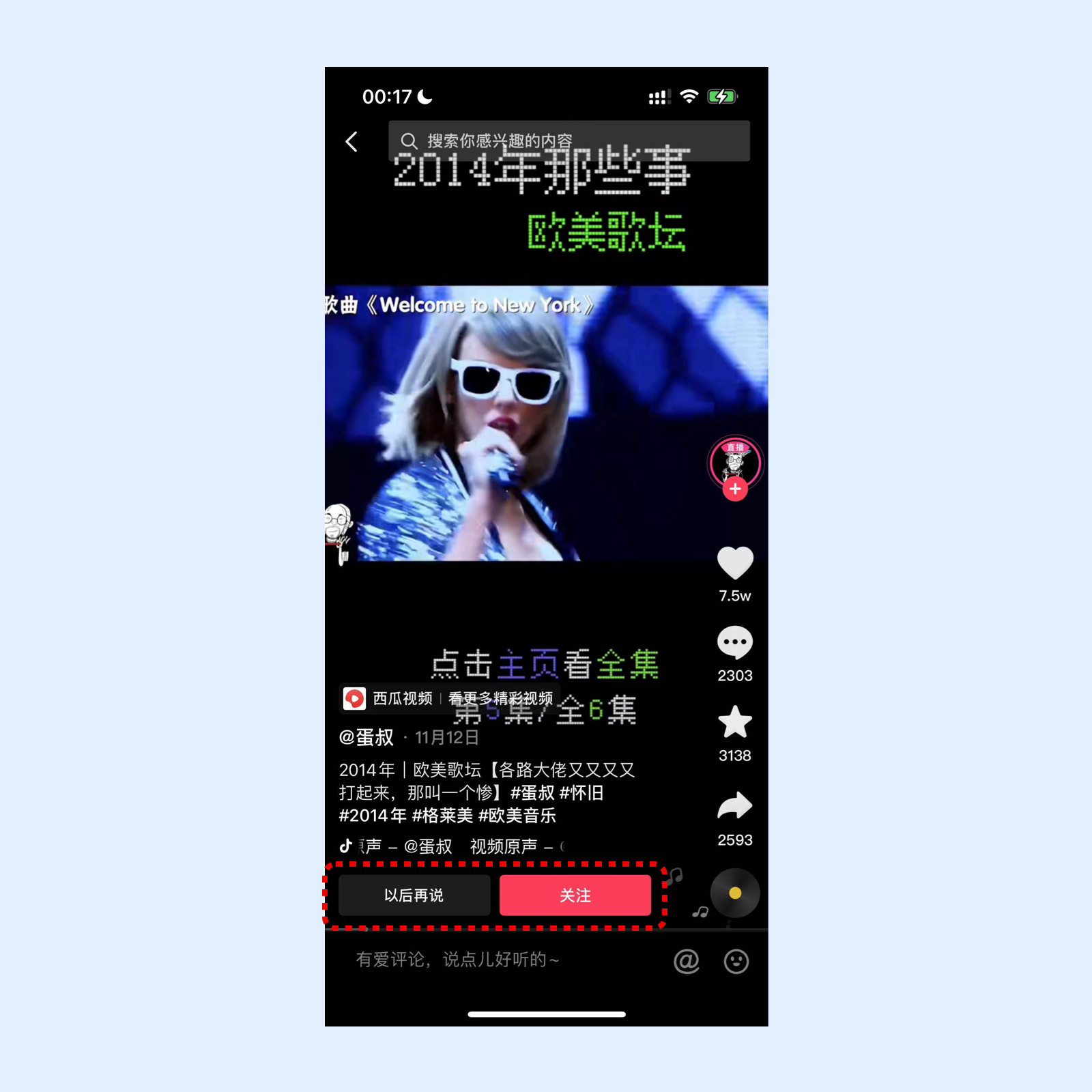 在抖音观看视频时,长时间停留在该up主的页面时,在作者信息下会显示出关注的颜色饱和度较高的按钮,也可以点击以后再说。
