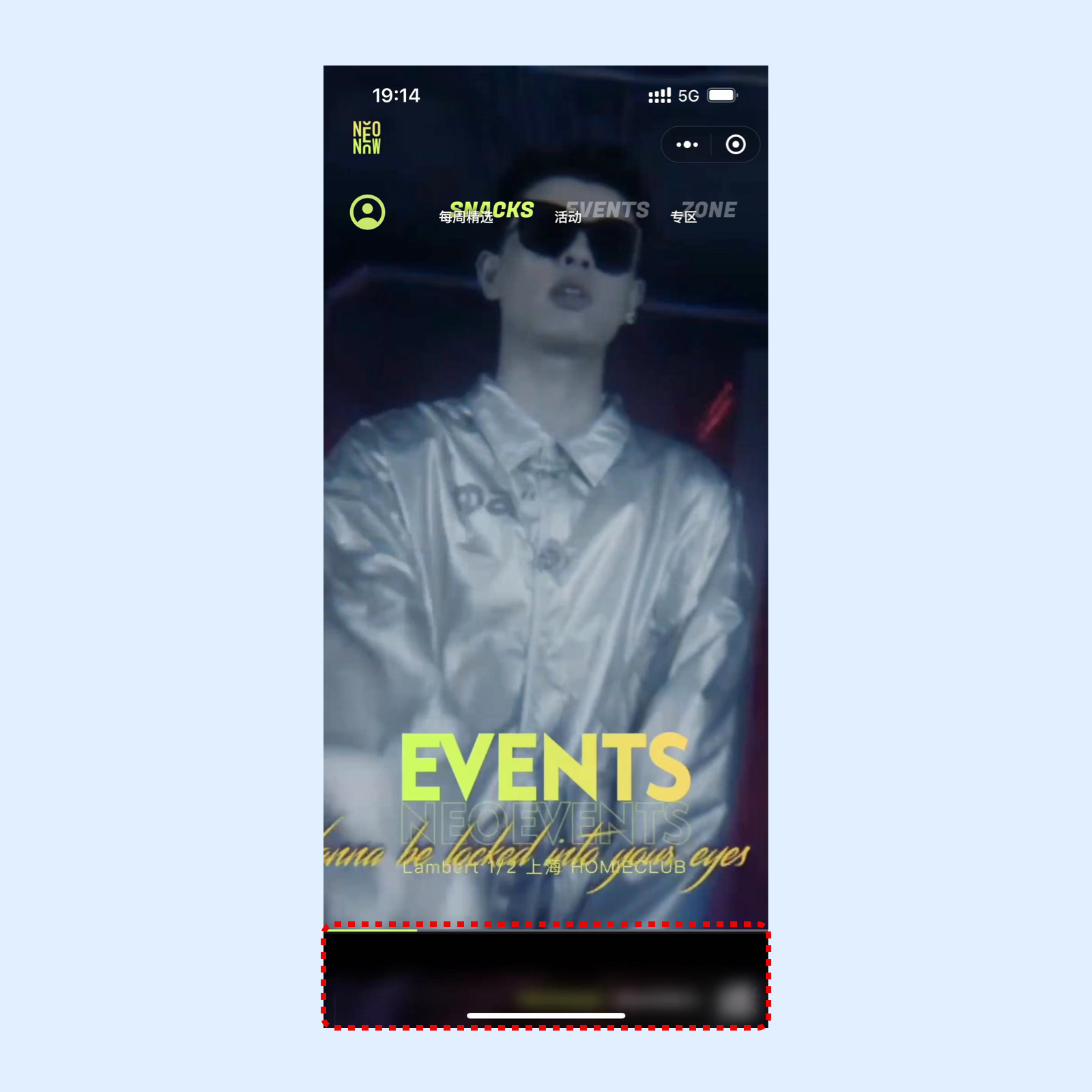 在微信小程序中打开此刻霓虹,进入首页后是沉浸式的演出列表,可以向下划动查看。
