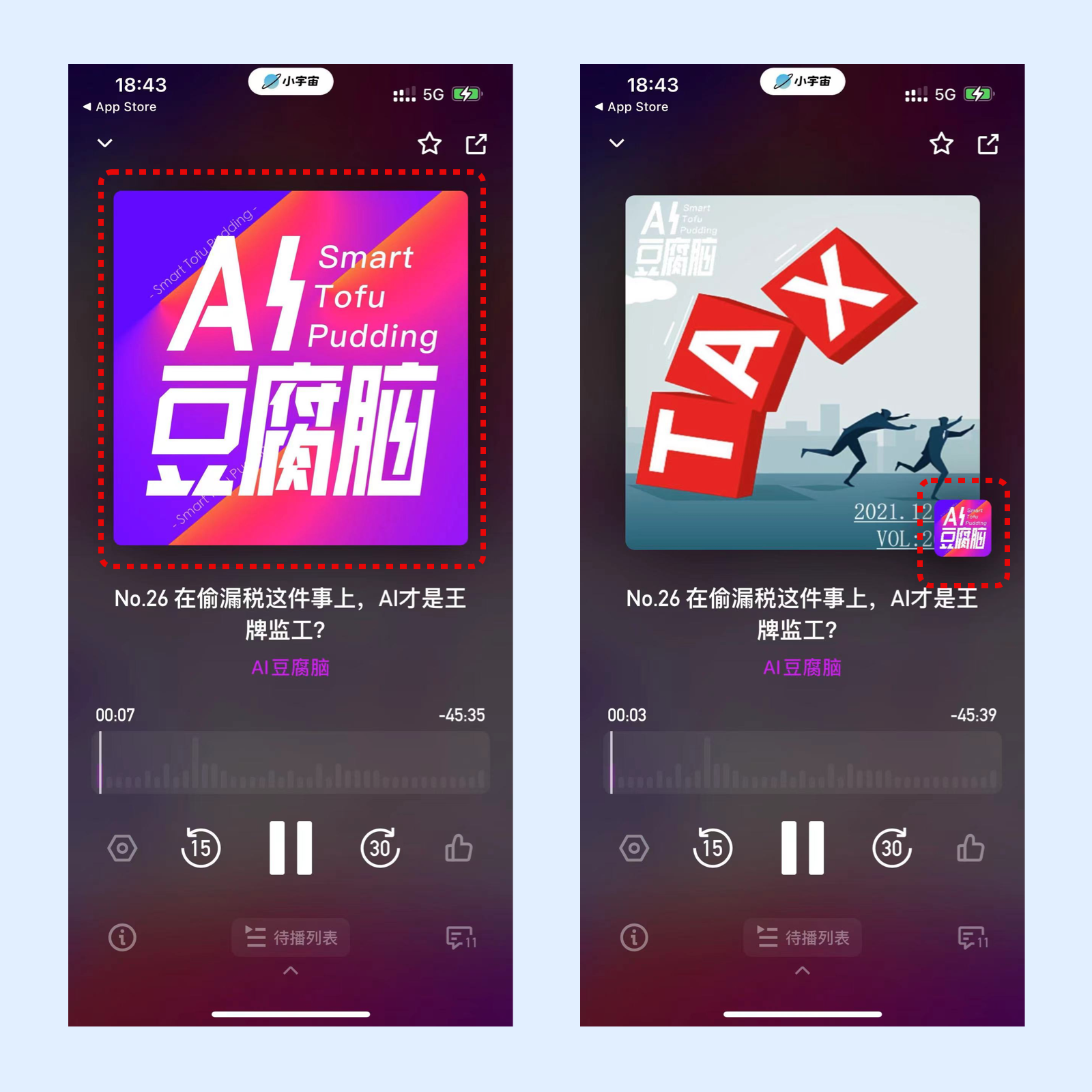 在小宇宙中收听电台节目,在播放页中首先展示播客的头像,之后缩小至右下角显示封面,再次点击头像后可以放大。