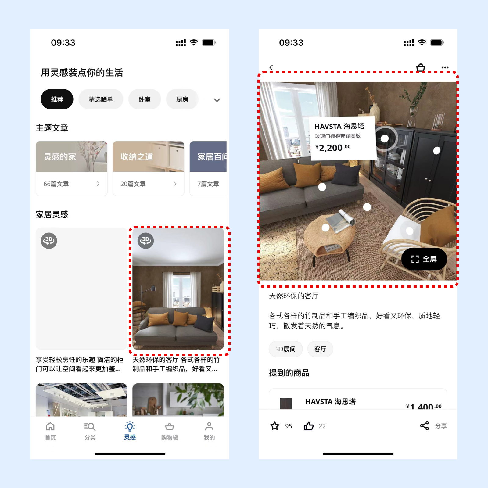 在宜家中灵感模块里,可以看到有的列表左上角有3D字样,点击卡片进入详情后可以看到图片中有可点击提示,点击后显示家具的具体价格。