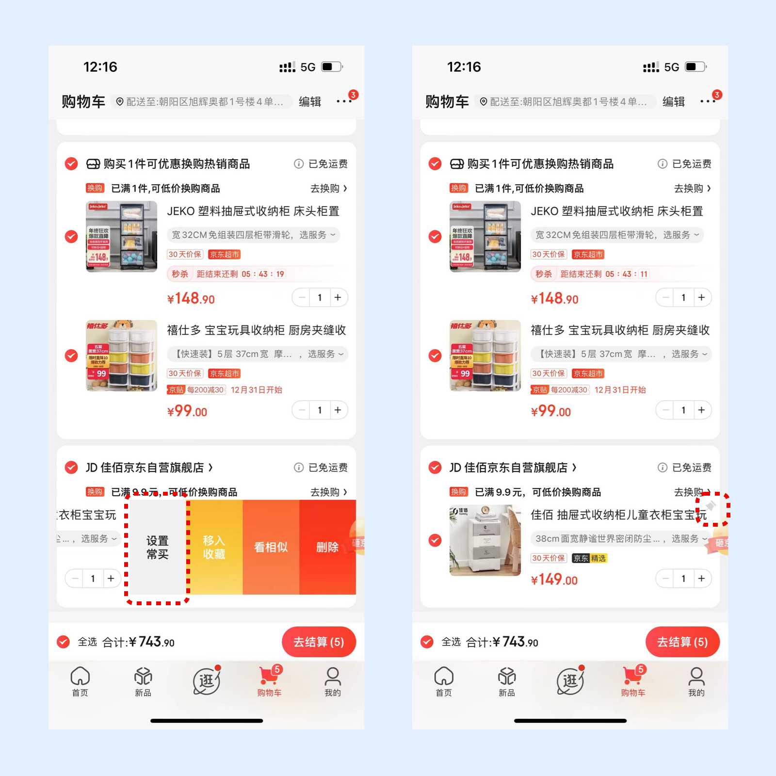 在京东中选好自己想买的商品加入购物车,在购物车中左划商品卡片出现删除、看相似、收藏和设置常买。其中点击设置常买后,该商品卡片右侧会出现一个图钉icon,删除被标记的商品时会出现提示该商品被设置常买的提示。