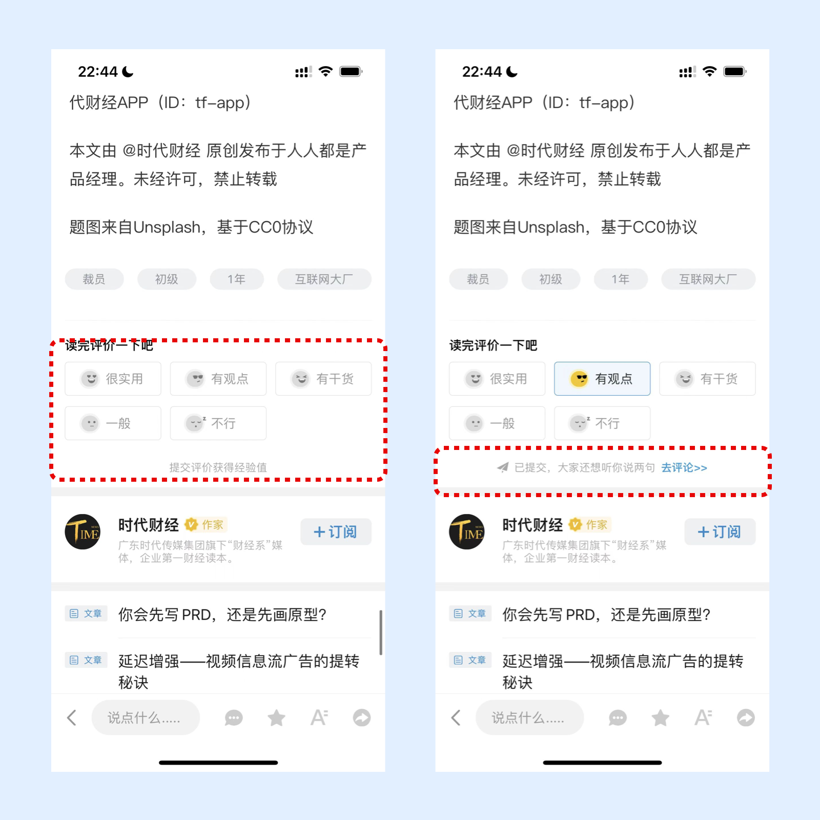 在产品经理中,阅读文章之后可以看到有一个读完评论一下吧的功能,只要点几小表情就可以完成评论,点击之后提交完成可以看到显示出一行去评论的入口,可以点击继续深入评论。