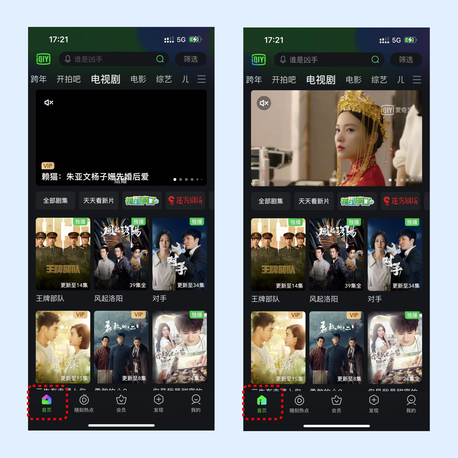 进入爱奇艺之后,切换几个模块,底部标签的选中与未选中按钮动效有变化。