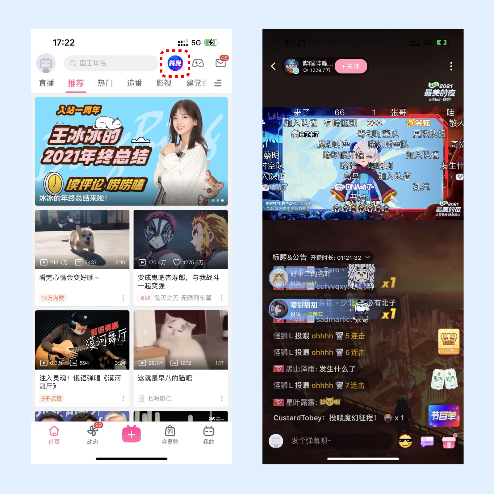 最后一天的体验我们来到了b站,这里的突出入口让我联想到了12.11的QQ音乐盛典,从app商店直接进入了晚会的直播,这样重要的直播在产品中越来越多的使用了超强的透出,用户可以最快的进入这一天最重要的直播间,节省了用户在没有快速入口的情况下多次点击去直播间的路径,同时,闪动的icon也是对晚会广告的一个良好提示宣传,吸引用户的视觉注意。