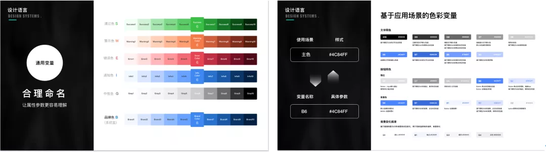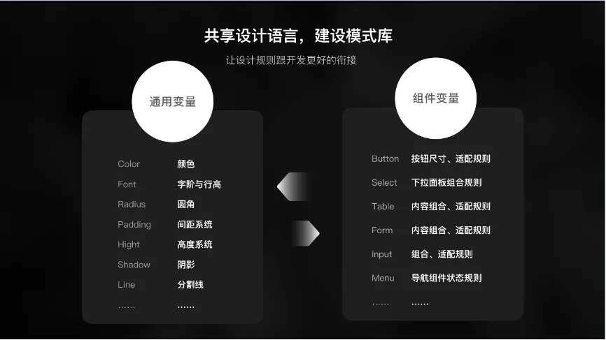 借鉴前端思维来设计和输出规范,用于存储视觉设计部分的具体参数,建立一种共享语言,让设计规则跟前端更好的衔接,实现工程化的界面设计。通过与开发人员一起讨论,对设计变量名称的合理定义,让属性参数更容易理解,建立通用变量的统一命名,以及对组件变量的规则制定,使用在沟通中约定的规则,会使得设计和开发过程更加容易。