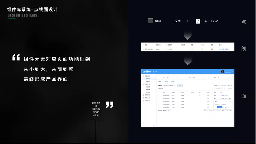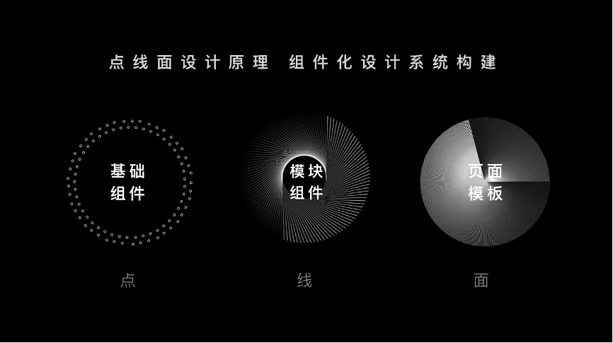 当设计师遇到同一类组件设计场景时,对于高可复用的界面,根据自己的业务模式,对组件、模块做出合理的舍弃,让业务场景解决方案的设计和实施者能够通过配置管理实现落地。在实际操作中,通过点线面设计的方法,对需求结构梳理,组件元素对应页面功能框架从小到大,从简到繁,基本可以形成页面的框架结构。点线面设计提供的最大的优点之一就是能够在抽象和具体之间的灵活转换,我们可以同时看到我们的界面分解成点和线的元素,也可以看到这些元素如何结合在一起形成我们的最后体验。点线面设计就体现了这一事实,三个不同的阶段协同工作,以产生有效的用户界面设计系统。