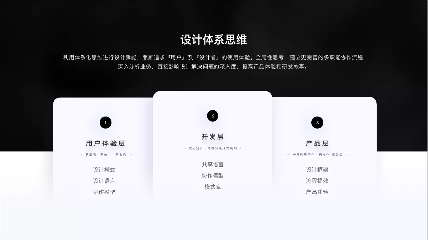 设计体系思维,帮助我们跳出设计的单一层面,去思考从产品层、到体验层、再到开发层这一完整的整体。让设计满足体验层的同时,满足产品层面的目标,同时让产品的设计与开发高度耦合,将整个产品串联成一个整体。体系化的建立和推动,需要整个产品团队拥有一致的目标,并为之通力协作才能完成。