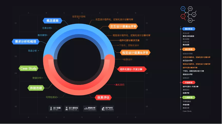使用GTD方法论,协助整理及构建组件化系统,并依据对很多组件库的调研,除对产品业务的理解和掌握之外,还针对业务场景进行整体分析,提取可以组件化的逻辑和功能样式,并对这些共用组件进行归类、梳理。最终输出 基础组件、导航组件、数据输入、数据展示、反馈,5大类,共计50多组组件。只有设计标准与团队协作标准完美融合,才能建立真正的组件系统。控制产品的“生产结果”,提升产品质量;还能规范产品的“生产过程”,形成一套完整的多职能协作流程,保证效率、成本、体验之间的平衡。