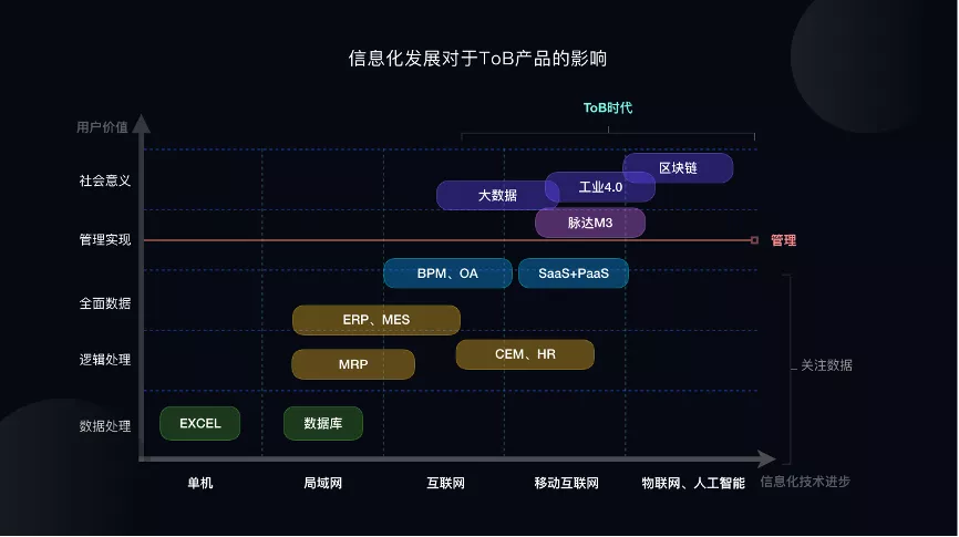 了解互联网的发展与产品设计的大环境,了解ToB时代产品设计发展的需要,从信息化技术的发展看出,产品设计初期是基于数据库理论,逐步增加业务逻辑操作,思维模式是以“数据”为基础,初期设计通常只是根据“业务场景”的工作内容,设计对应的数据及相关逻辑关系,构成的简单的功能操作界面。当业务日益增加,需求盘根错节,相互关系越来越复杂时,整个结构就会变得非常复杂,不仅开发成本高,修改、调整也会变得异常困难。