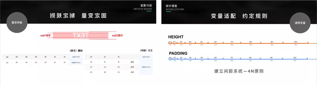 又如,在建立字阶与行高时,为界面提供更灵活的字体行高适配,设定紧缩、常规和宽松三个数值的行高,这样可以更好的为B端业务服务,根据界面信息展示的需要选择行高,满足不同产品对于屏效的要求;在建立间距系统时,我们所有的间距变量都遵循4N系统…等等,通过这样变量约定,保障界面细节有效统一,并在规范文档中补充说明使用场景、极端适配规则,方便适配多种需求,保障工程化的界面设计的可实施,使具备界面码化能力,从而大幅度降低迭代成本、扩展性增强等等。。。