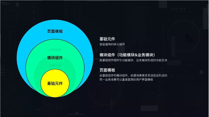 回归到业务中,对组件库的重要组成部分,以系统化的设计思路,进行层次化、结构化的圈定,依据不同的颗粒度 拆解为基础元件、功能模块、业务模块、页面模板。