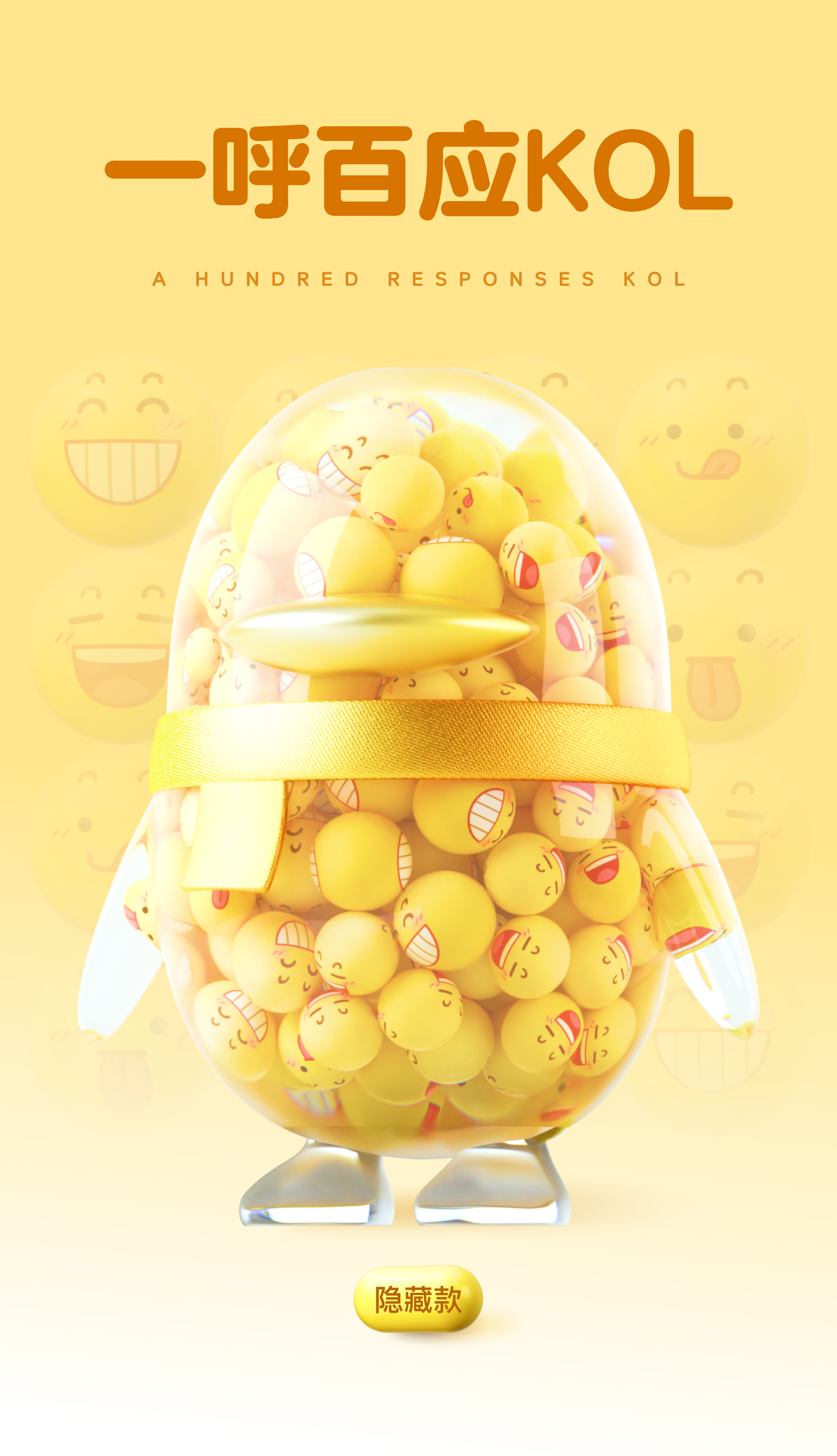 在QQ形象设计上,我们根据不同的社交关键词进行了不一样的设计,包括样式、材质、颜色等,这些不一样的设计在隐藏款上尤为突出。例如针对社交关键词“一呼百应KOL",此社交关键词形容的是人气高,是众人的焦点,为了体现这种超高人气,QQ形象通体采用透明材质,并在内部放置了很多不同的体现开心的黄脸表情。