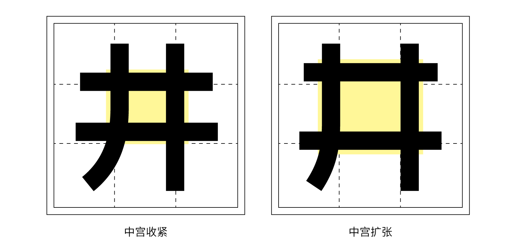 中宫和布白密不可分。字体设计中的中宫和书法中宫概念基本类同,中宫收紧是汉字书法的一种处理方式。