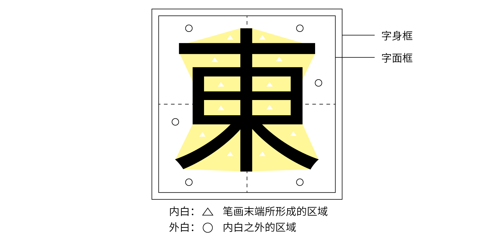 在汉字字体设计中,为了方便观察布白,又将布白分为内白和外白。内白即单字笔画末端连接在一起形成的外接多边形白空间,外白即内白之外到字身框的白空间。