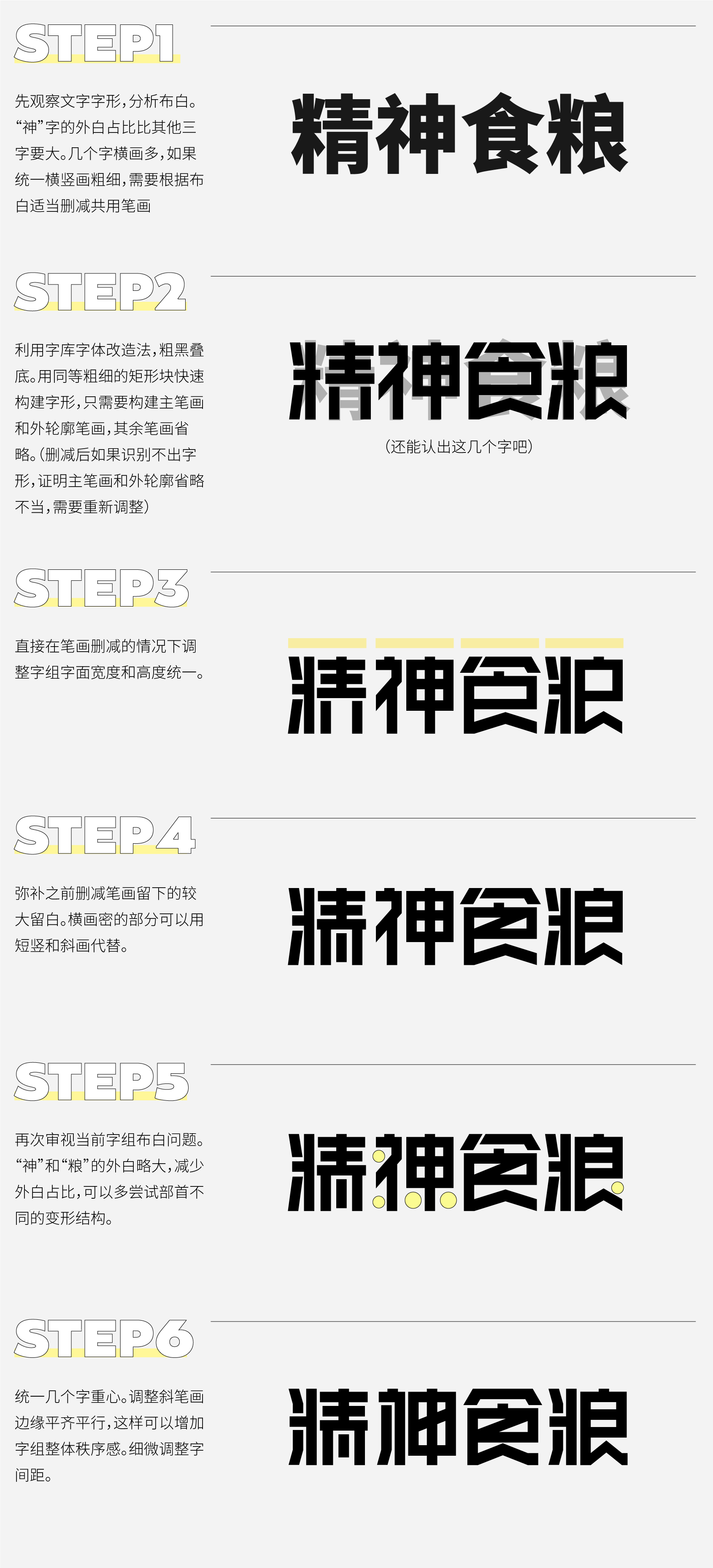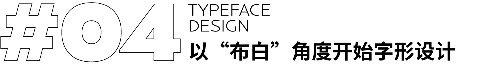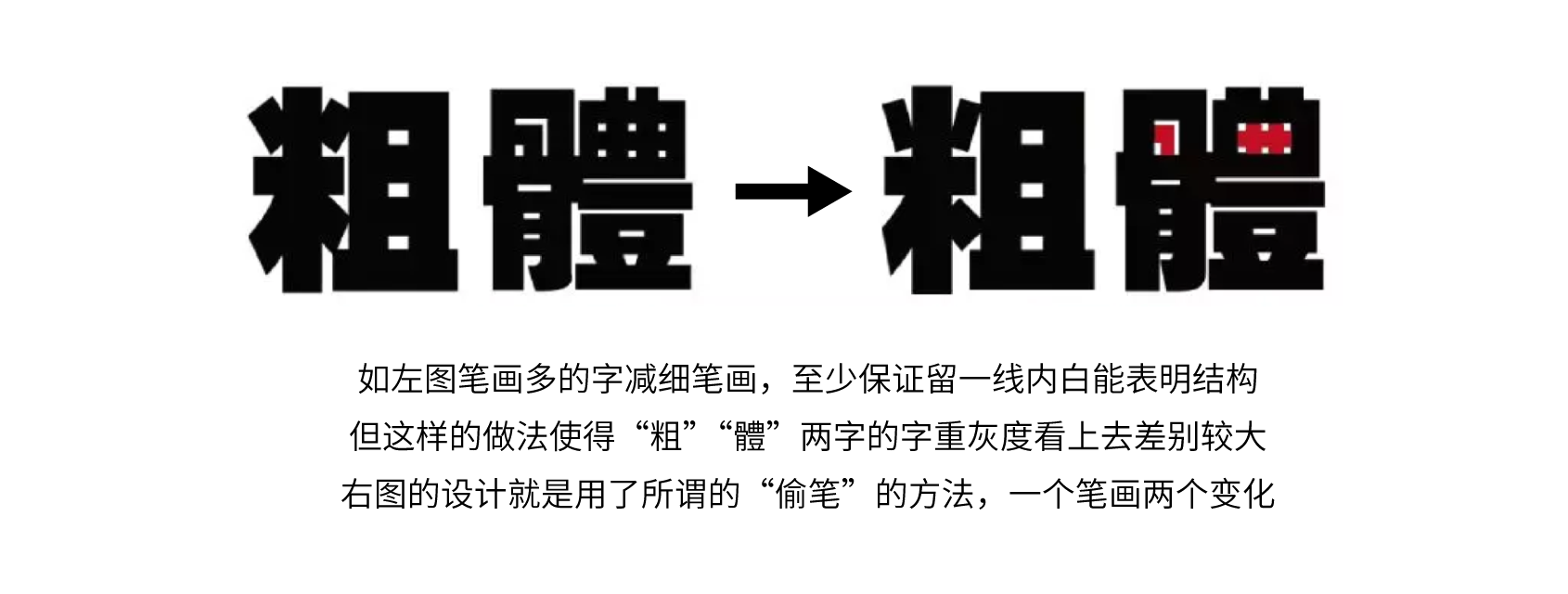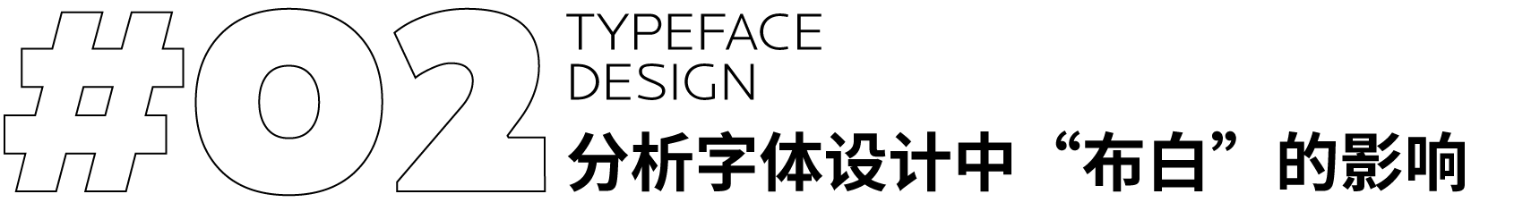 同样是设计大字重且保证笔画粗细统一的前提下,可以直接从改变布白空间展开设计。可以利用一些特殊的布白调整手段:删减笔画、共用笔画、断开笔画。通过这些手段让布白更合理。不用过多做笔画粗细上的变化。