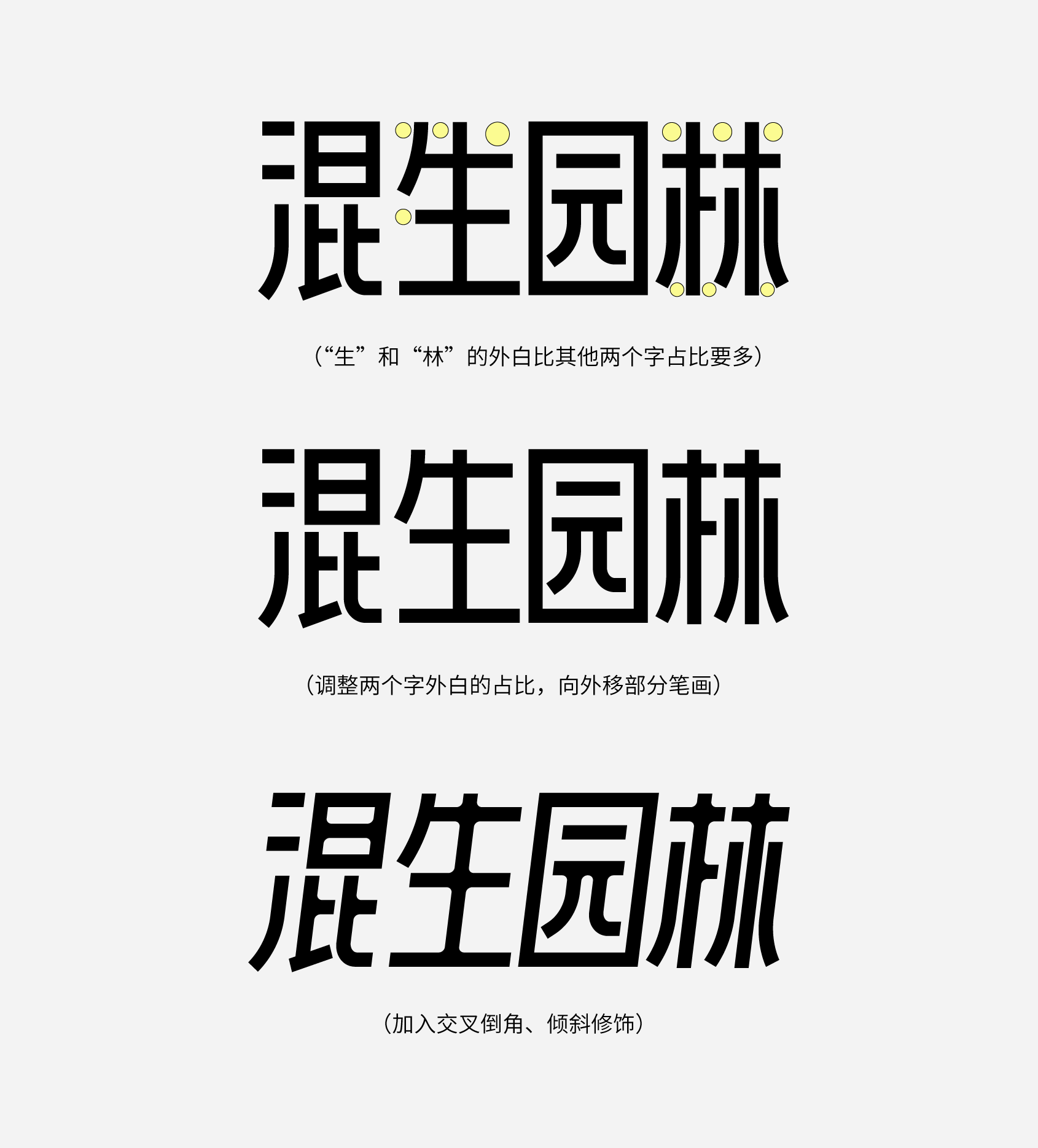 我们在设计品牌LOGO字形时,常常要解决几个字的视觉大小统一问题,为了让字形在vi中更加规范化,许多初学者在做字时会先画矩形框约定好字面大小,所有字的笔画边缘都紧贴矩形框,以此来达到字面大小的统一,但是这样做我们会发现某些字形字面大小在视觉上看并不统一,比如下图混生园林中“生”字和“林“字””与其他字比明显小了,180°旋转后以图形的视角去观察尤为明显。