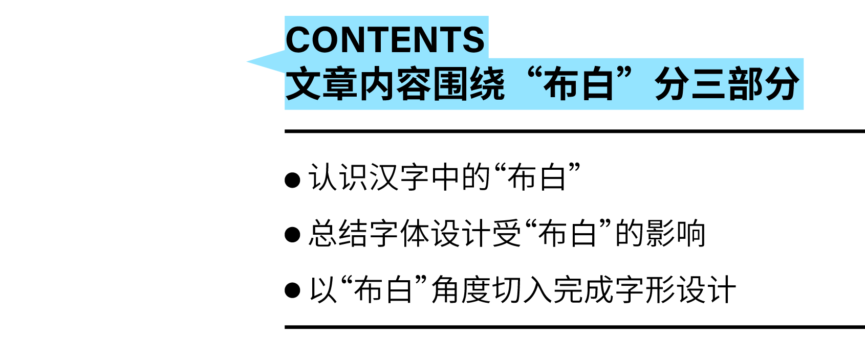 “布白”这一概念来源于传统汉字书法,是传统汉字艺术重要的审美准则。相传东晋书圣王羲之所著的《笔势论十二章》最早提出过布白的概念:“分间布白,远近宜均,上下得所,自然平稳”。以追求布白匀称,来到达字形视觉协调的状态。现代字体设计理论中对于“布白”的理解依旧沿用了书法理论中的部分观点。
