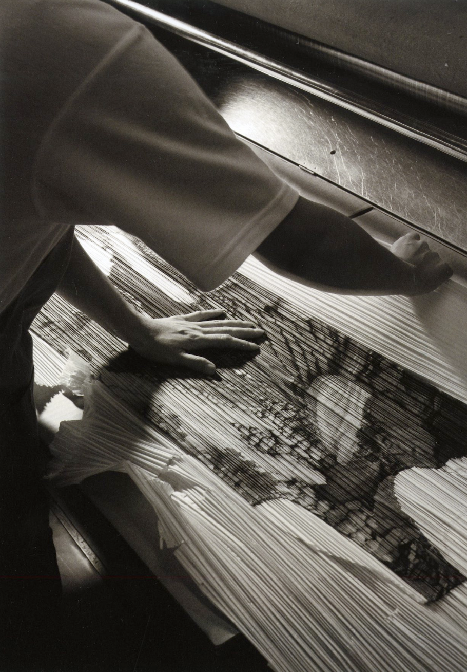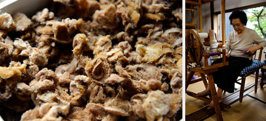 德岛县的女性勤俭持家,每一块碎布都不会随意丢弃,而是将之抽成丝,再重复利用。由于经线是棉,而纬线是丝,这种名叫“薇”的织布方法,正是因为材质的不同,所以才会创造出一种凹凸感,三宅一生便是从此处得到了创造新布料的灵感。