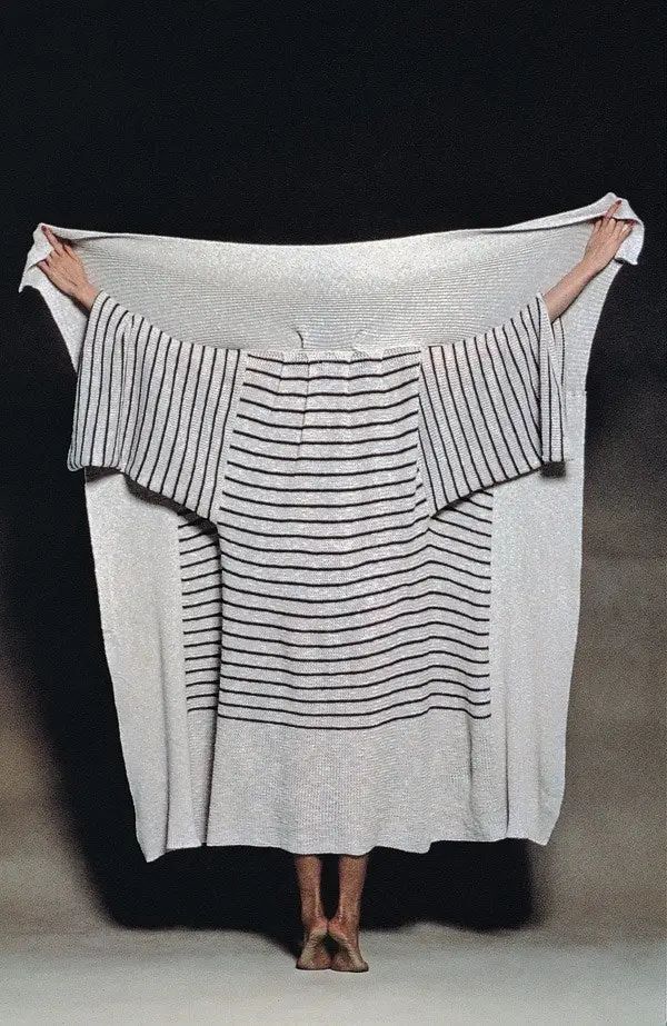 不久后,三宅一生找寻到传统手工织布,这是一种濒临失传且需要保护的艺术品,而三宅一生则为它的保存和传承做出了杰出贡献。这不仅使三宅一生服装的面料独树一帜,同时还使服装因为面料脱胎于传统工艺而天然拥有传统文化的DNA,也为第二年名震西方的服饰系列作品《纹身》奠定了面料工艺的基础。